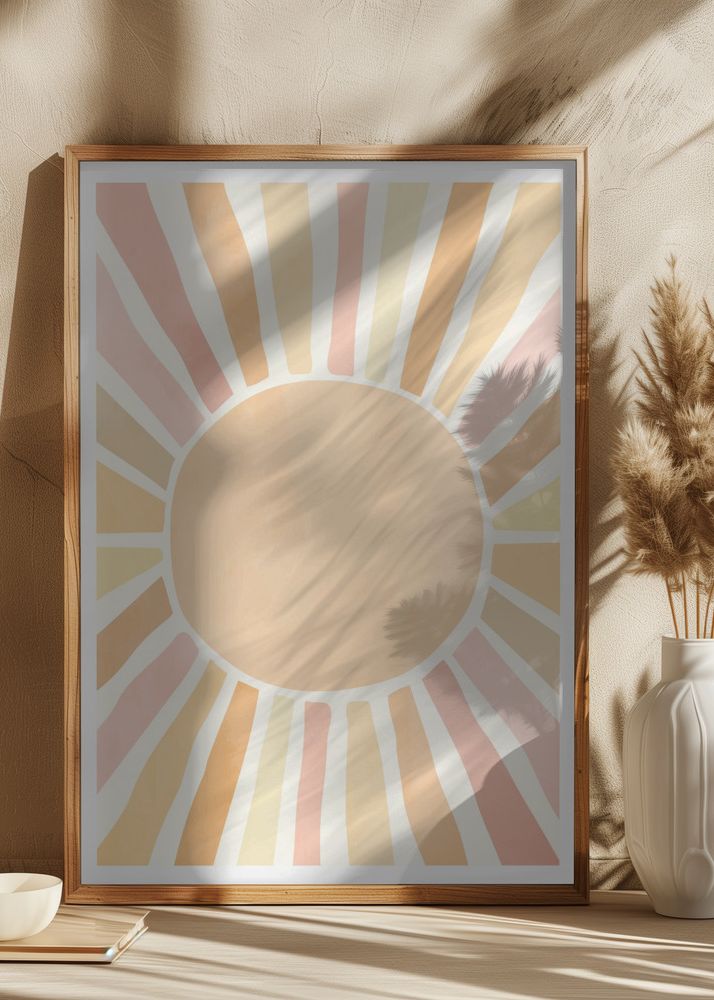 Upptäck vår solstråle-motiverade poster som infuserar ditt hem med en ljus och värmande atmosfär. Denna print utstrålar en känsla av optimism och glädje genom sitt stilrena solstråle-mönster. Perfekt för att ge varje rum en touch av modern och inspirerande konst som både är iögonfallande och lugnande.