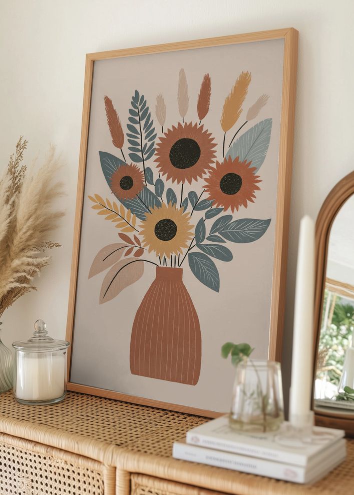 Denna vackra poster fångar essensen av höstens skönhet med ett stilrent motiv av en blomsterbukett i en rustik vas. Affischen är perfekt för att addera en trendig och naturlig känsla till ditt hem. De solrosliknande blommorna står i full blom och ger en känsla av livfullhet och energi till rummet.