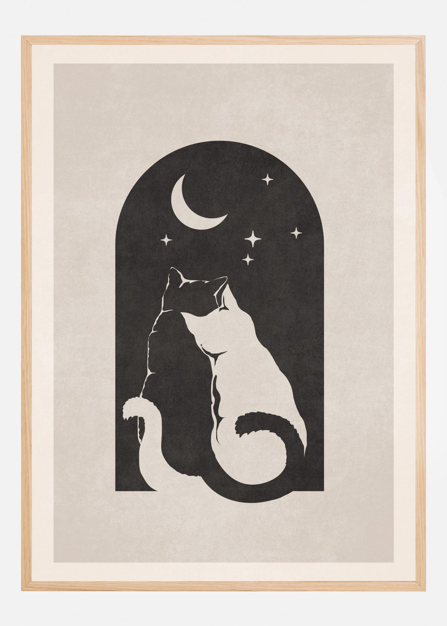 Denna konstnärliga poster framställer en stilren och känslomässigt laddad scen av en katt som sitter och betraktar en måne och stjärnor. Dess konturer skapas genom kontrasten mellan det silvriga motivet och den mörka bakgrunden, vilket ger en lugn och harmonisk känsla. Denna print skulle kunna passa väl i ett hem som värdesätter minimalistisk och suggestiv design.