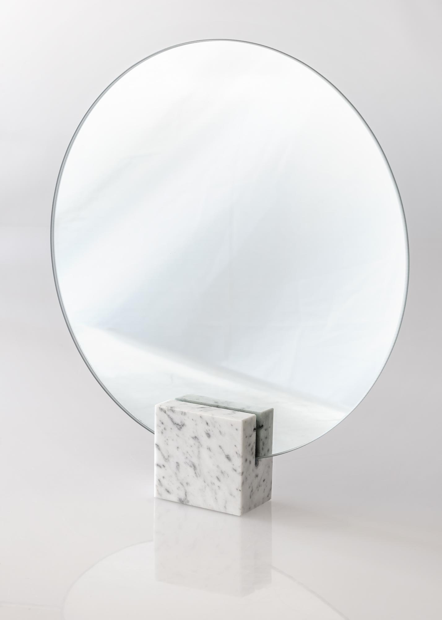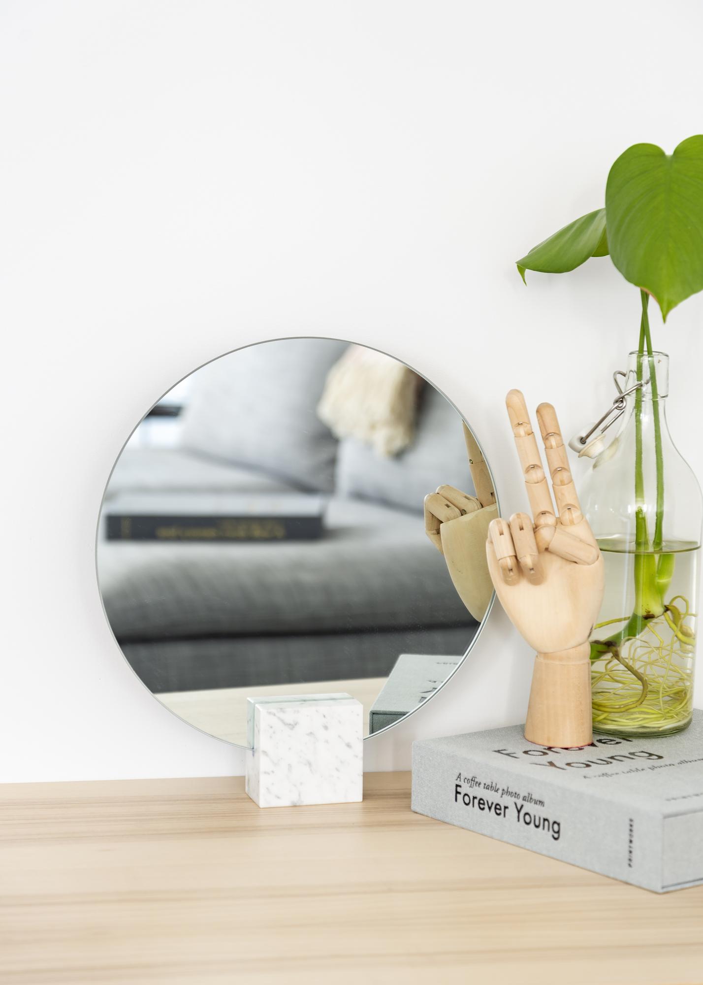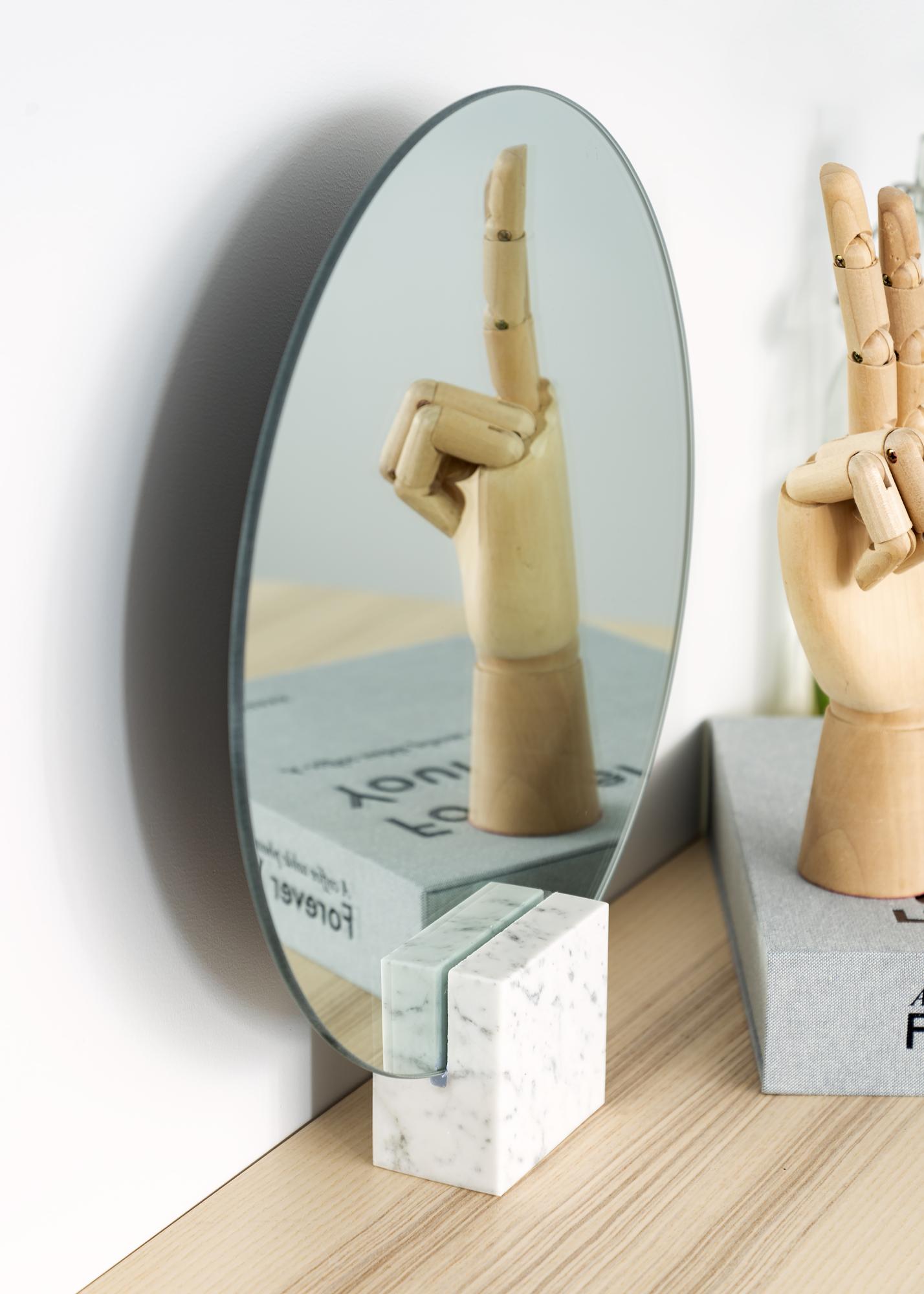 Denna runda bordsspegel har en mycket stilfull design. Det mjukt runda spegelglaset i kombination med det kantiga stödet i marmor skapar en intressant och mycket tilltalande kontrast.