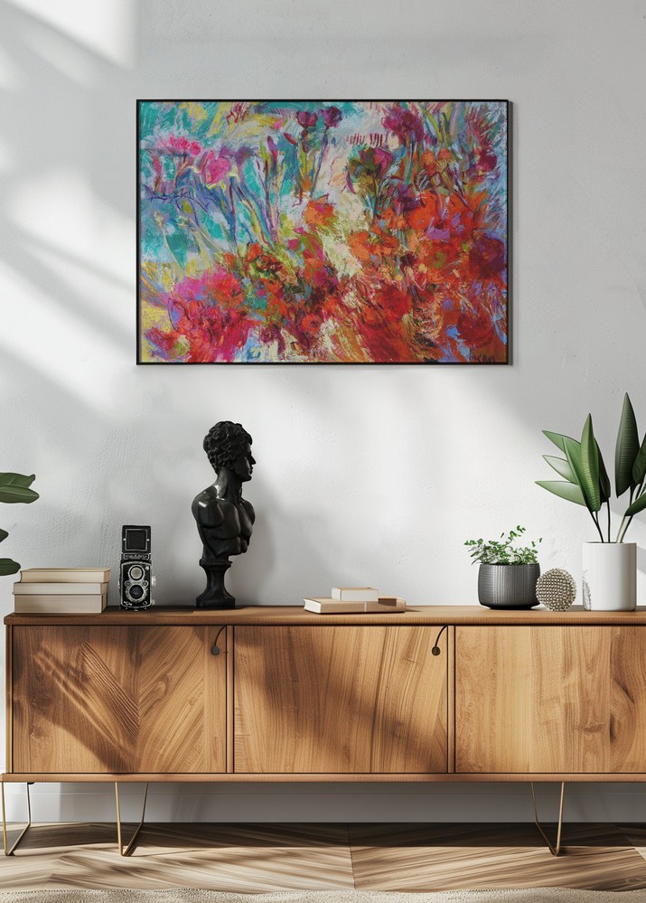 Denna livfulla poster föreställer en färgsprakande blomsteräng som fångar ögat med sin dynamiska komposition. Motivet är en explosion av vilda blommor som dansar i vinden, och det bjuder på en känsla av otyglad frihet och kreativitet. Denna print är perfekt för dig som vill liva upp ett rum med en konstnärlig touch och ett naturligt tema.