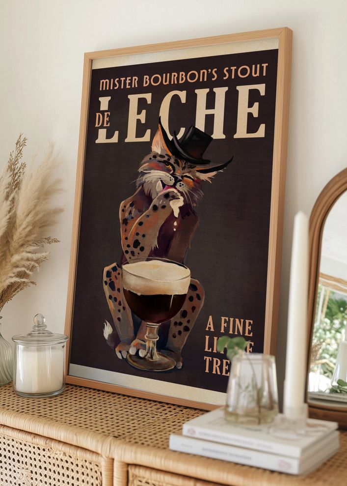 Denna unika poster fångar ögat med sitt lekfulla och eleganta motiv av en charmig katt iklädd en hög hatt. Perfekt för älskare av både humor och stil uttrycker denna print en känsla av lyx och nöje. Orden "MISTER BOURBON'S STOUT DE LECHE" ger en nostalgisk känsla av klassiska affischer, vilket gör den idealisk för att skapa en retro atmosfär i ditt hem.
