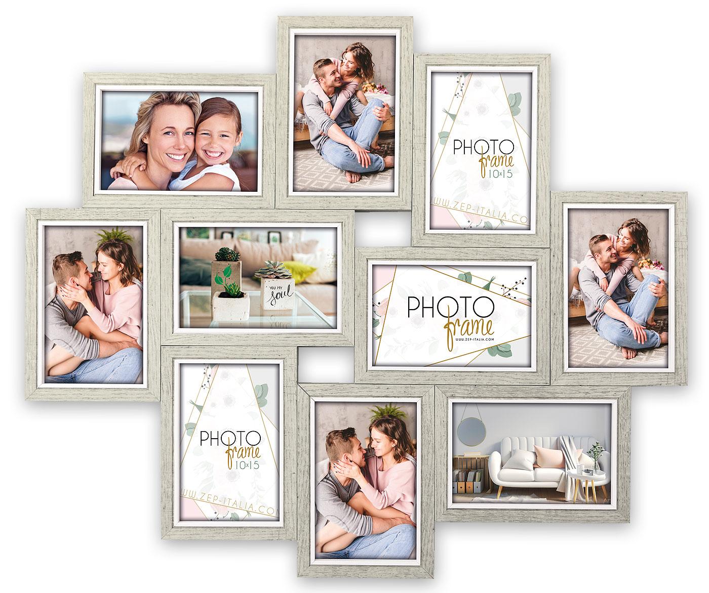 Detta är en snygg collageram med plats för 10 bilder i 10x15 cm. Collageramen är tillverkad i trä och går i en ljusgrå nyans vilket ger den en mer rustik karaktär. Ramens yttermått mäter 50x59 cm. Väggfäste finns.