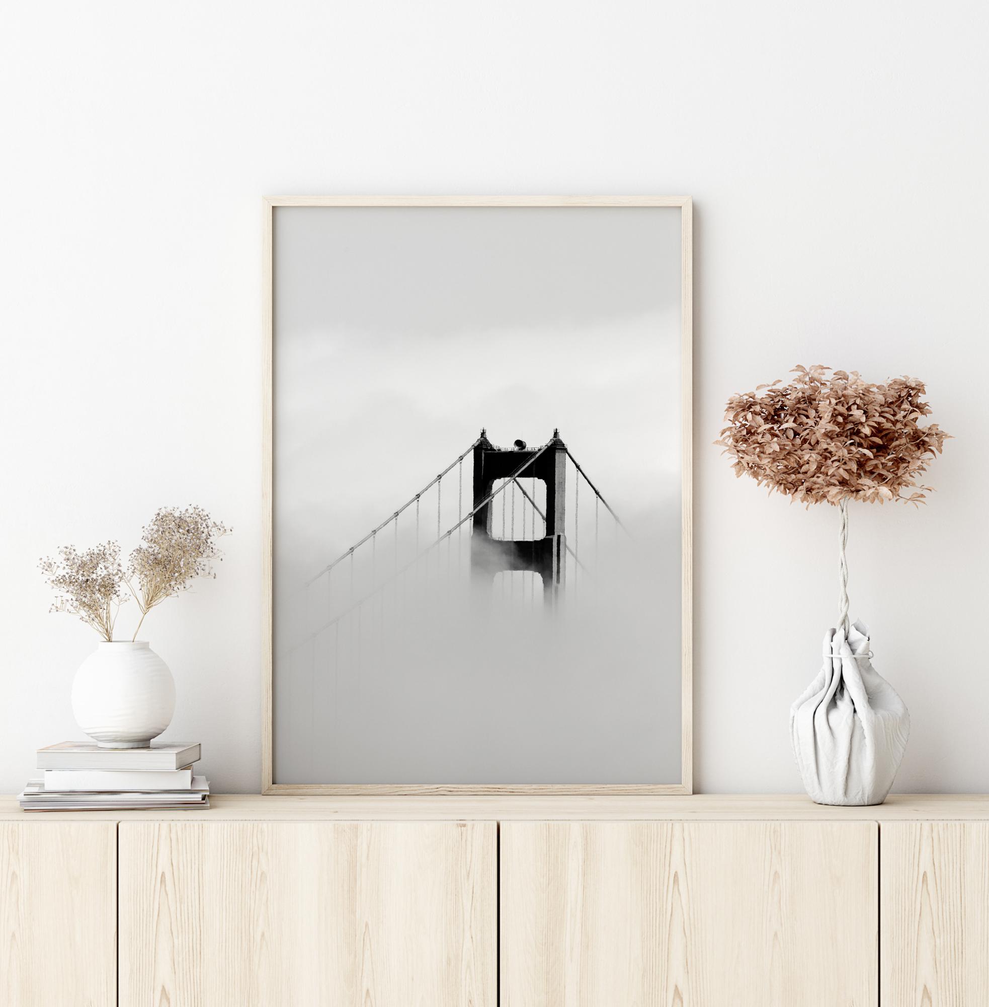 En dramatisk poster med toppen av en bro. Dimman stiger och döljer hela bron utom toppen. Svart och solid, stiger bron upp mellan den molniga himlen ovanför och dimman nedanför. Njut av den här fantastiska bilden när du har den här postern på väggen.