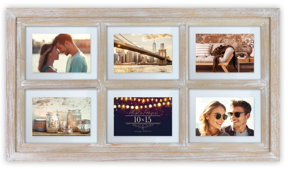 Liggande collageram i ljust trä. Detta är en ram som rymmer 6 foton i bildstorlek 10x15 cm, och låter dig enkelt arrangera en grupp bilder tillsammans på ett finns sätt. Ramen har lite träskildringar som ger den en rustik men samtidigt lantlig karaktär. Ramens yttermått mäter 38,5x69,5 cm. Väggfäste finns.