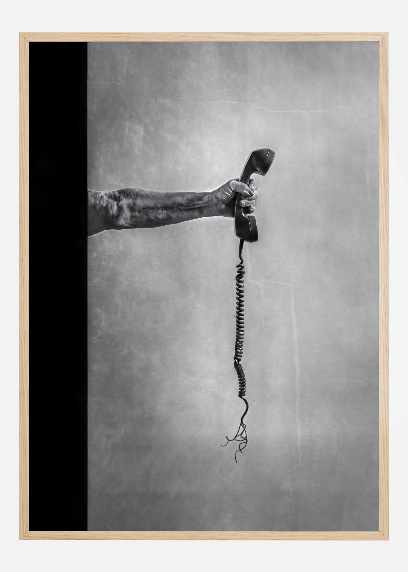 En svartvit poster med en arm som håller en telefonlur med avskuren sladd. Den starka armen håller telefonen i mitten av bilden. Den svarta telefonen och sladden hänger ner mot en grå bakgrund. Vem är det som telefonen sträcks ut till? Koppla av och ta in den här bilden medan den hänger i ditt hem.