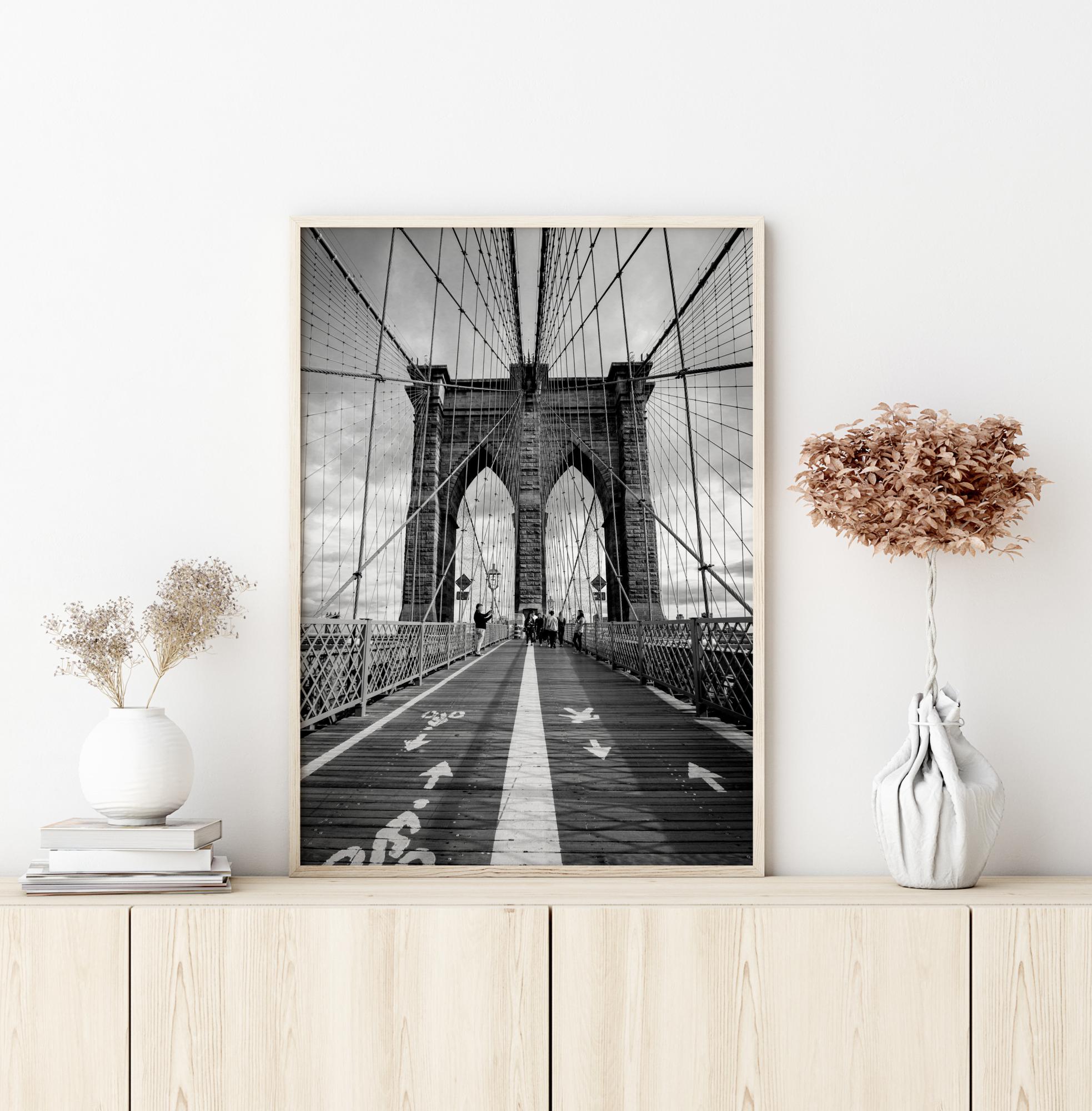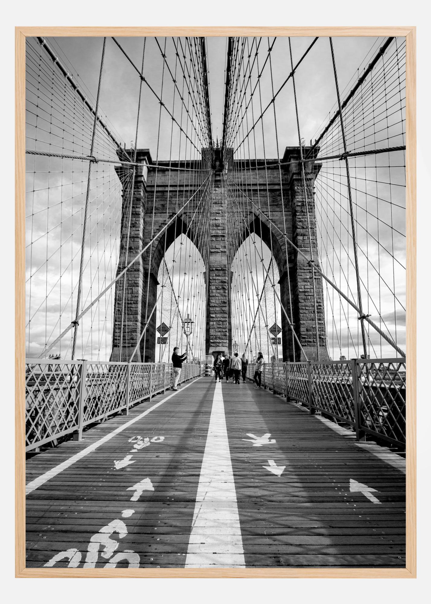 Ett svartvitt fotografi på Brooklyn Bridges gångstråk, mäktiga torn och spännande upphängningsanordning i form av stålwirear i stora rutnät. En poster som gör sig utmärkt i kombination med andra favoriter i ett större collage.