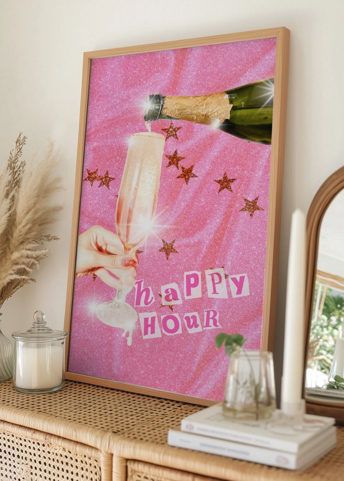 Färgerna i denna trendy print inkluderar champagneguld från flaskan och glaset, mjuka nyanser av rosa i bakgrunden, och detaljer i vitt och glitter som accentuerar texten "happy hour". De stjärnformade gnistorna bidrar med en känsla av rörelse och liv. Denna affisch är ett utmärkt val för att inspirera till glädje och feststämning när det där lilla extra behövs.