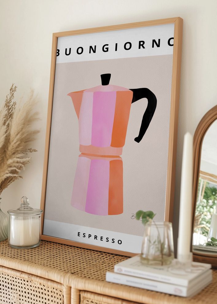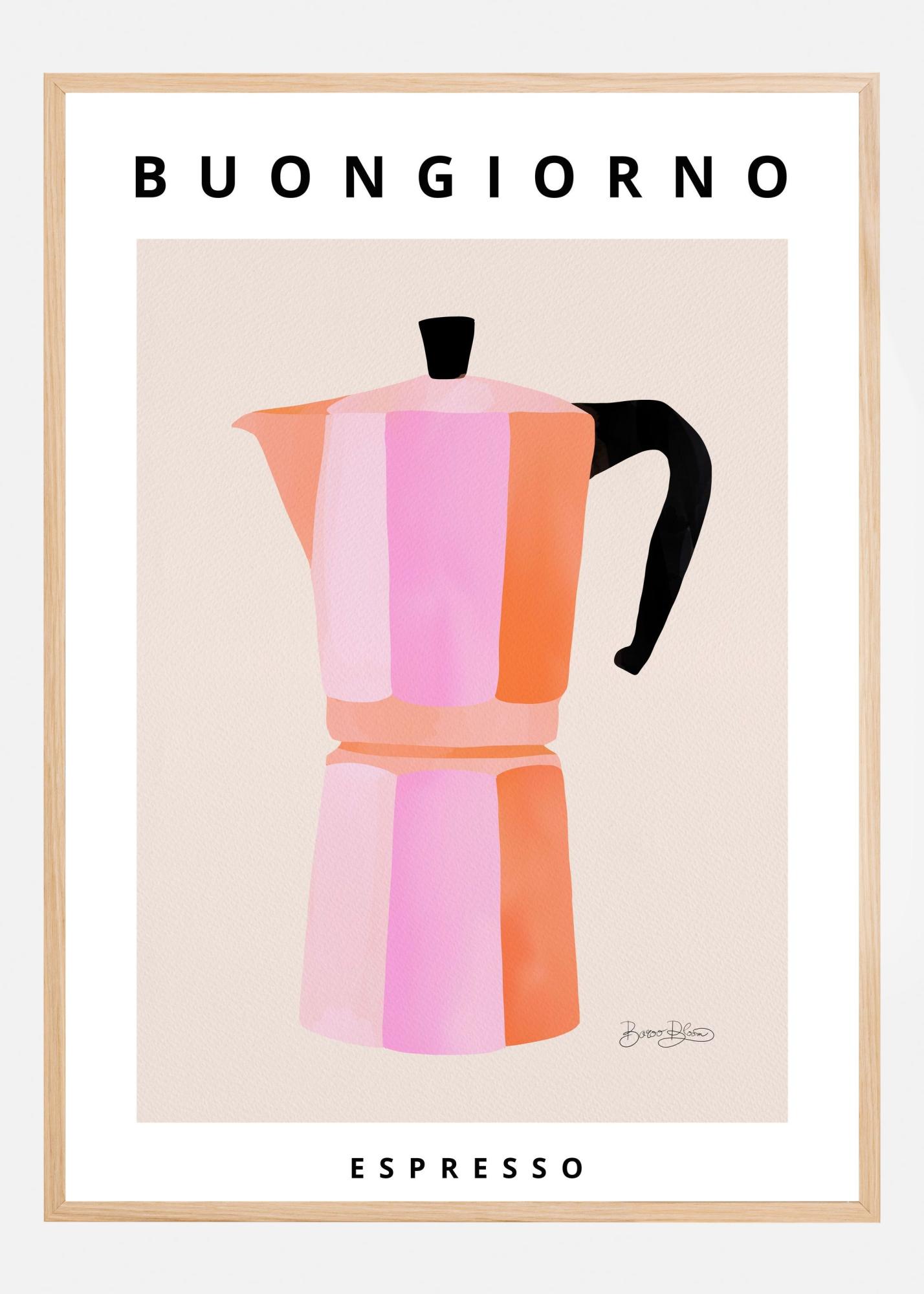 Denna poster föreställer en stilren och modern illustration av en espressomaskin, perfekt för att addera en sofistikerad touch till ditt kök eller café. Motivet domineras av en elegant kombination av varma färger som rosa, orange och svart, vilket skapar en harmonisk och inbjudande känsla. Texten "BUONGIORNO" och "ESPRESSO" i klar svart ger en kontrasterande och framträdande effekt, vilket förstärker det italienska kaffetemat.