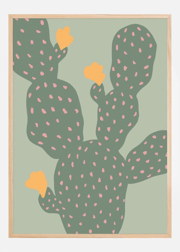 Denna lekfulla och charmiga poster framställer en stiliserad bild av en kaktus med ljusa accenter. Med sin mjuka gröna bakgrund och gröna kaktusfigurer punkterade med rosa prickar och gula blommor, erbjuder bilden en frisk och glädjefylld känsla. Denna konstprint kombinerar lekfullhet med en modern designestetik, och skulle vara en underbar väggdekoration i ett barnrum, ett ljust kök eller ett kreativt arbetsutrymme som kräver en dos av naturinspirerad humor och färg.