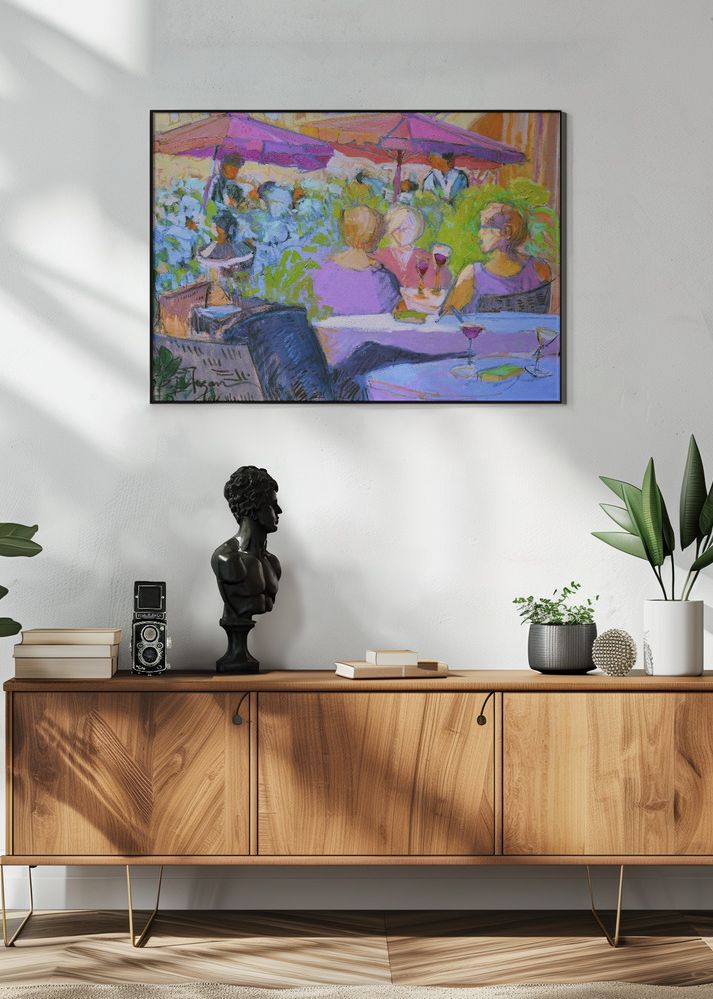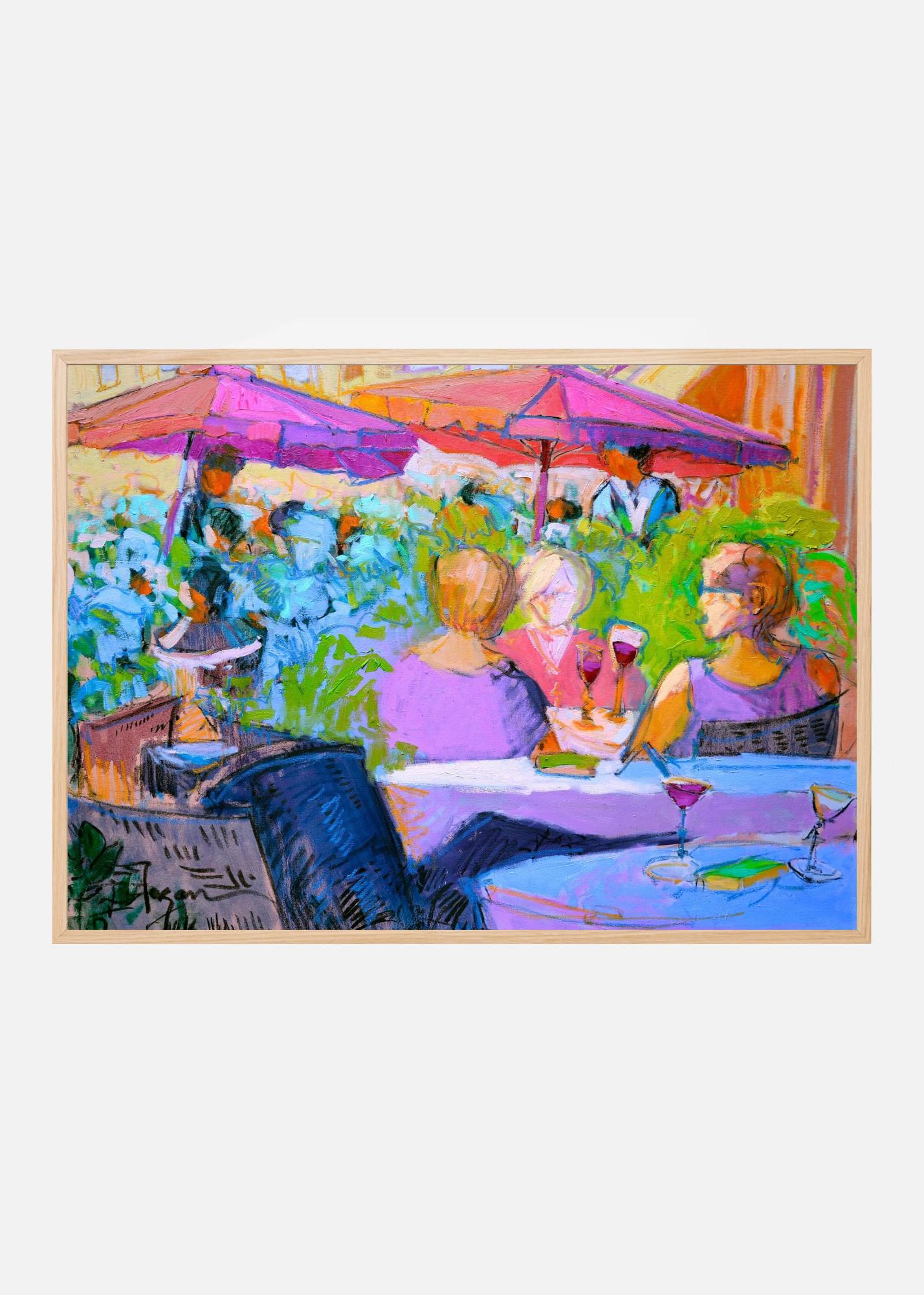Denna färgsprakande poster fångar en livfull uteservering med fokus på tre personer omgivna av sommarens grönska. Motivet bjuder in till en känsla av gemenskap och avslappnad atmosfär, perfekt för att förgylla ditt hem med en touch av urban sommaridyll. Denna print är ett utmärkt val för dig som älskar att ha livfulla och energigivande bilder i ditt hem.