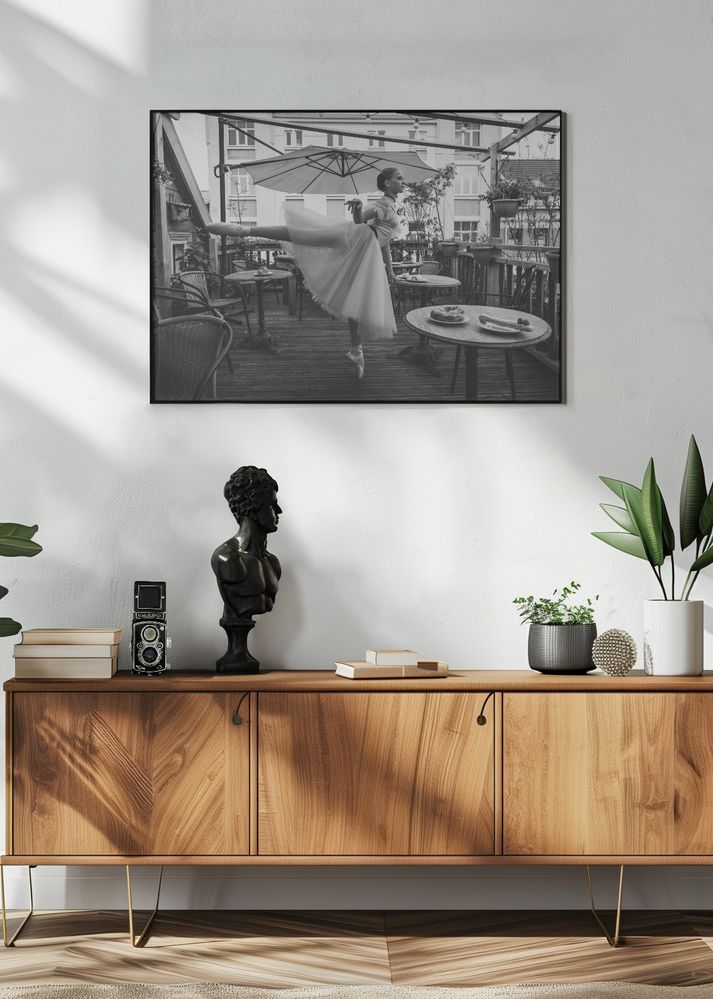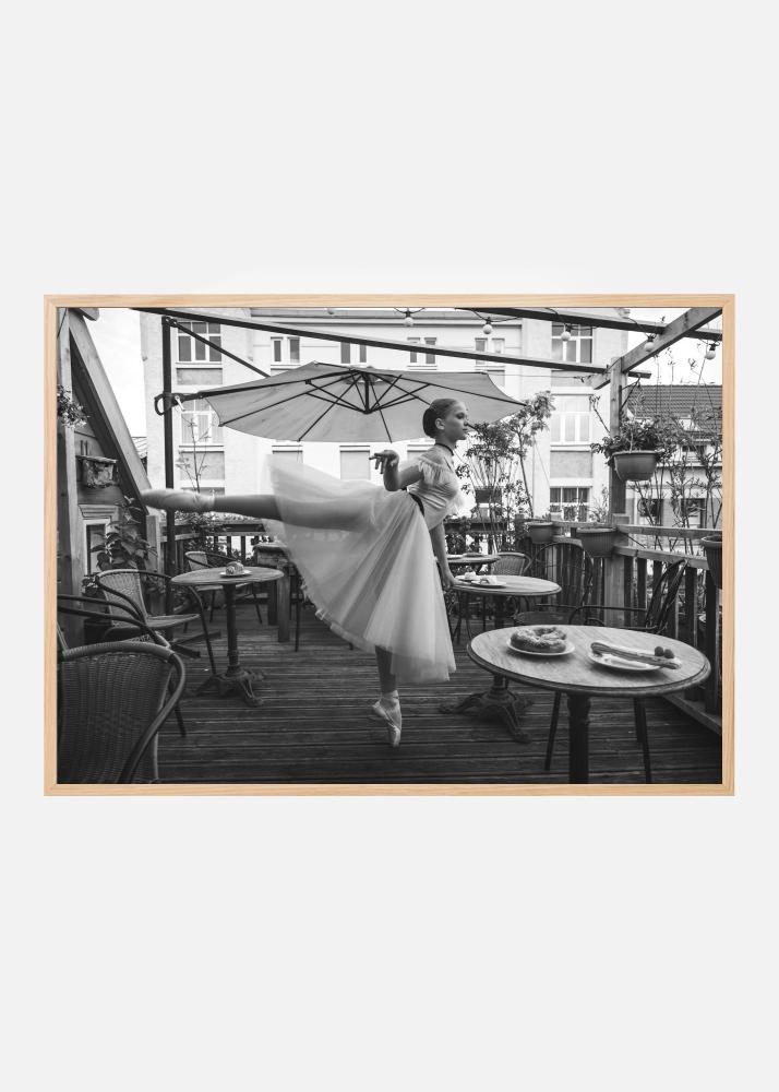Denna svartvita poster fångar magin i en elegant danspose, där en ballerina står i fokus på en terrass med stadsmiljö i bakgrunden. Bilden utstrålar grace och styrka, samtidigt som kontrasten mellan den mjuka tyllkjolen och det hårda trägolvet skapar en vacker visuell balans. Den svartvita färgpaletten ger bilden en tidlös känsla som passar in i både moderna och klassiska inredningsstilar.