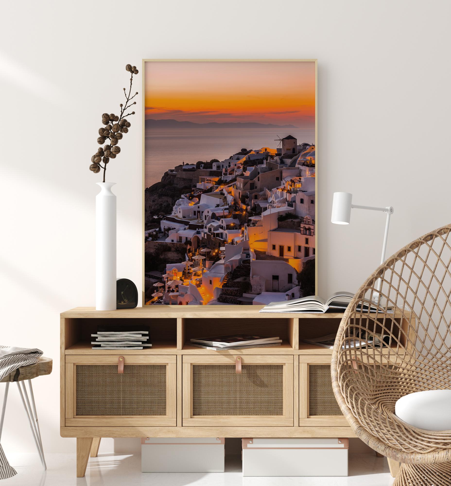 En scenisk poster med Calisera Santorini vid solnedgången. Den lilla staden lyser mjukt i gatulyset. De vita husen sticker ut med det mjuka, dimmiga havet och bergen i bakgrunden med den livliga himlen i solnedgången. Res bort utan att lämna hemmet medan du tittar på denna poster.