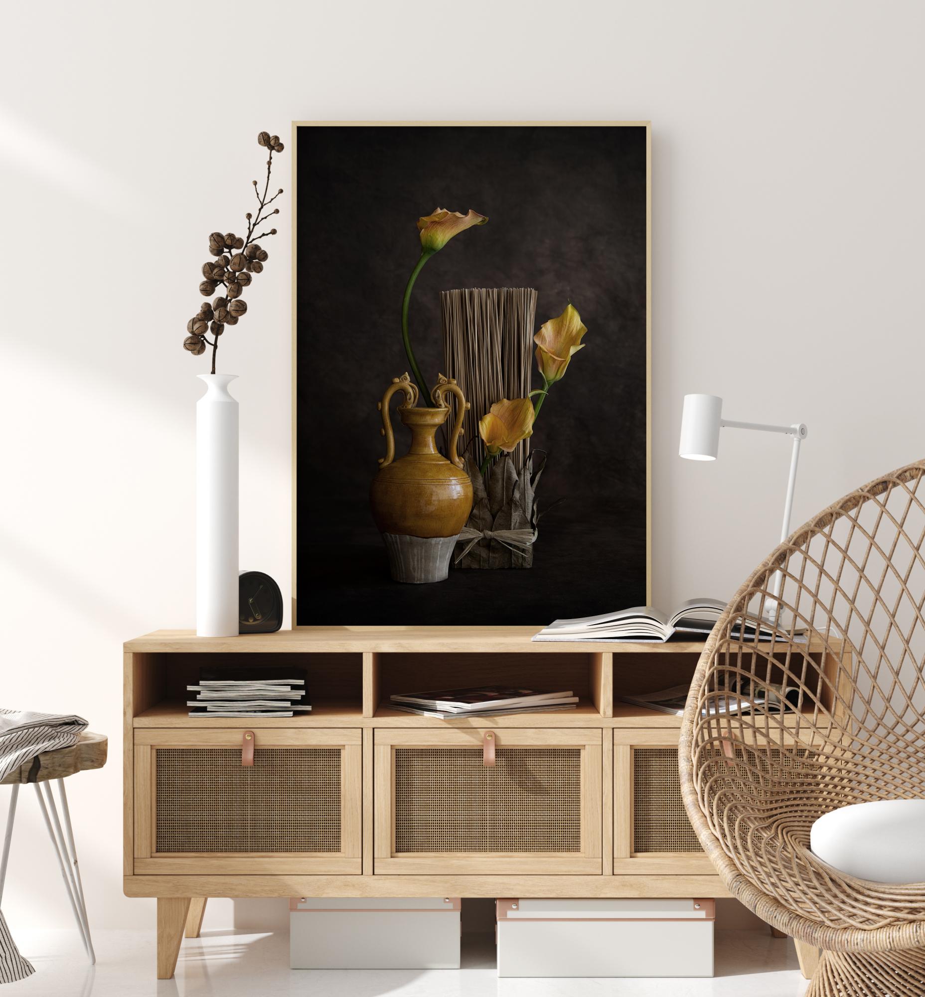 En stillebenposter med en kanna, torkade bruna stjälkar och tre liljeblommor. En svart bakgrund gör den senapsfärgade kannan och tre gula liljor sticker ut starkt. En lilja böjer sig upp mot toppen och för blicken runt verket. Häng upp den här för att få en touch av elegans i ditt hem.