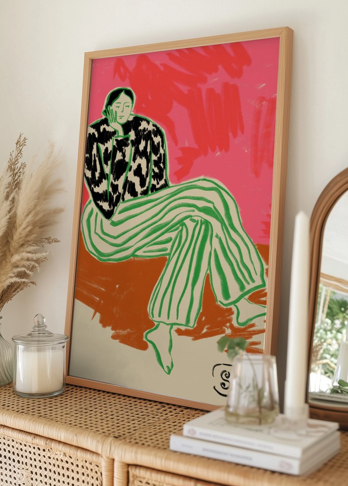 Denna poster erbjuder en unik konstnärlig stil med en djärv och uttrycksfull design. Motivet föreställer en person klädd i ett mönstrat svartvitt plagg, som ger en intressant kontrast till de omgivande färgerna. Bakgrunden är en livlig kombination av rödrosa och brun, vilket skapar en dynamisk känsla och fångar blicken omedelbart. De gröna och vita randiga byxorna tillför ytterligare en dimension och förstärker helhetsintrycket av denna moderna affisch.