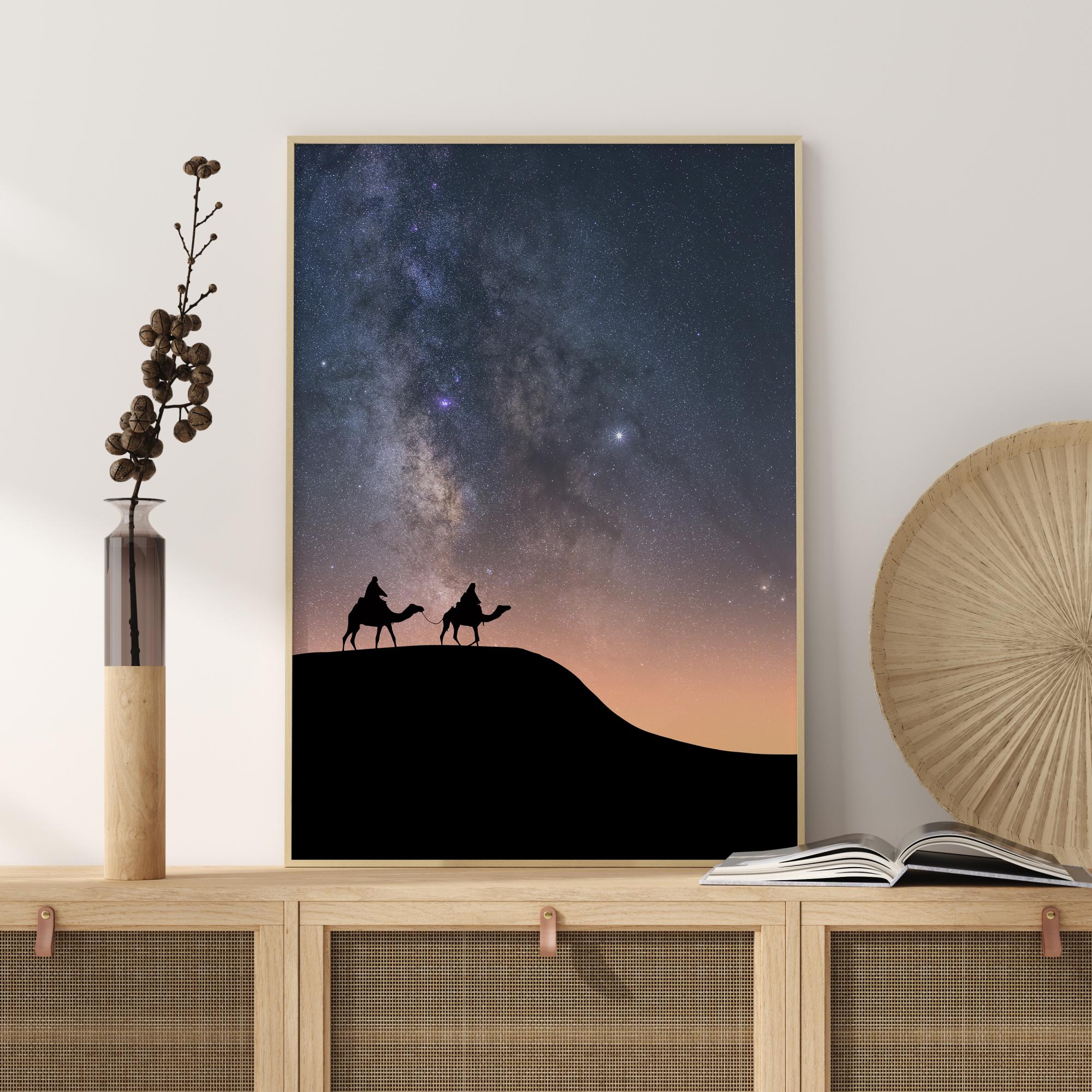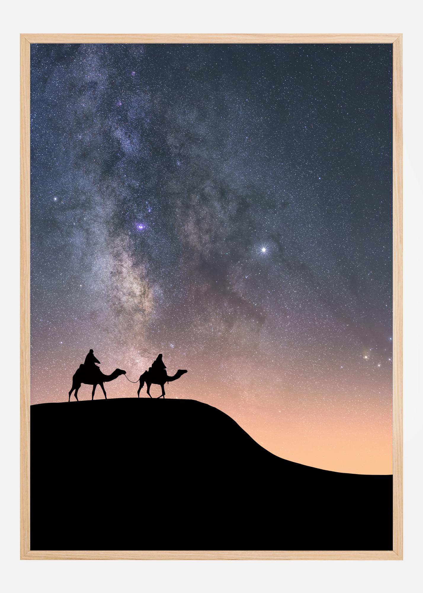 En dramatisk poster med två kameler under en stjärnhimmel. Vintergatan lyser ljust medan två kameler med sina ryttare är i silhuett under stjärnorna i det här episka fotot. En mjukt orange solnedgång ger mystik till denna scen. Res till en avlägsen plats när du hänger den här magiska scenen i ditt hem.