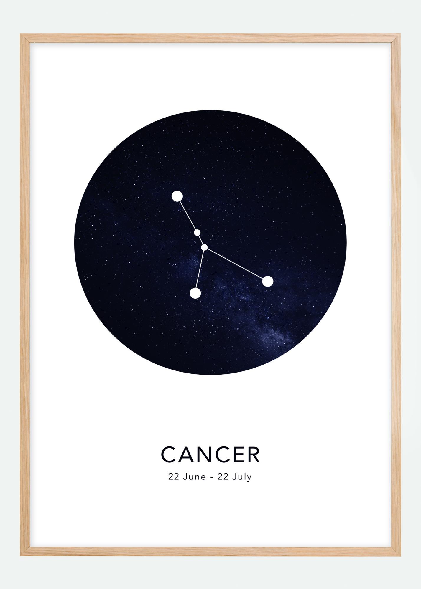Ge bort en personlig tavla till någon som du tycker om! Den här stilsäkra planschen har motiv av stjärntecknet Kräftan mot en bakgrund i form av en svart och blå stjärnhimmel. Nedanför finns namnet tillsammans med gällande datum på engelska.