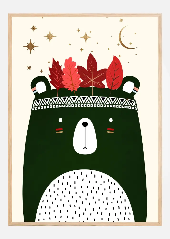 Denna charmiga poster föreställer en gullig björn omgiven av ett myllrande naturtema och är en perfekt väggdekor för den som vill addera en lekfull och omtänksam stämning i rummet. Motivet domineras av en stor björn i profil med ett mönstrat och framträdande parti över kroppen som ger en distinkt och intressant detalj. Ovanför björnen svävar symboliska inslag av stjärnor, en måne och höstlöv, vilket tillför en magisk känsla. Dessa små detaljer i kombination skapar en harmonisk och inspirerande affisch som lämpar sig utmärkt för alla åldrar och är speciellt passande för ett barns sovrum eller lekrum.