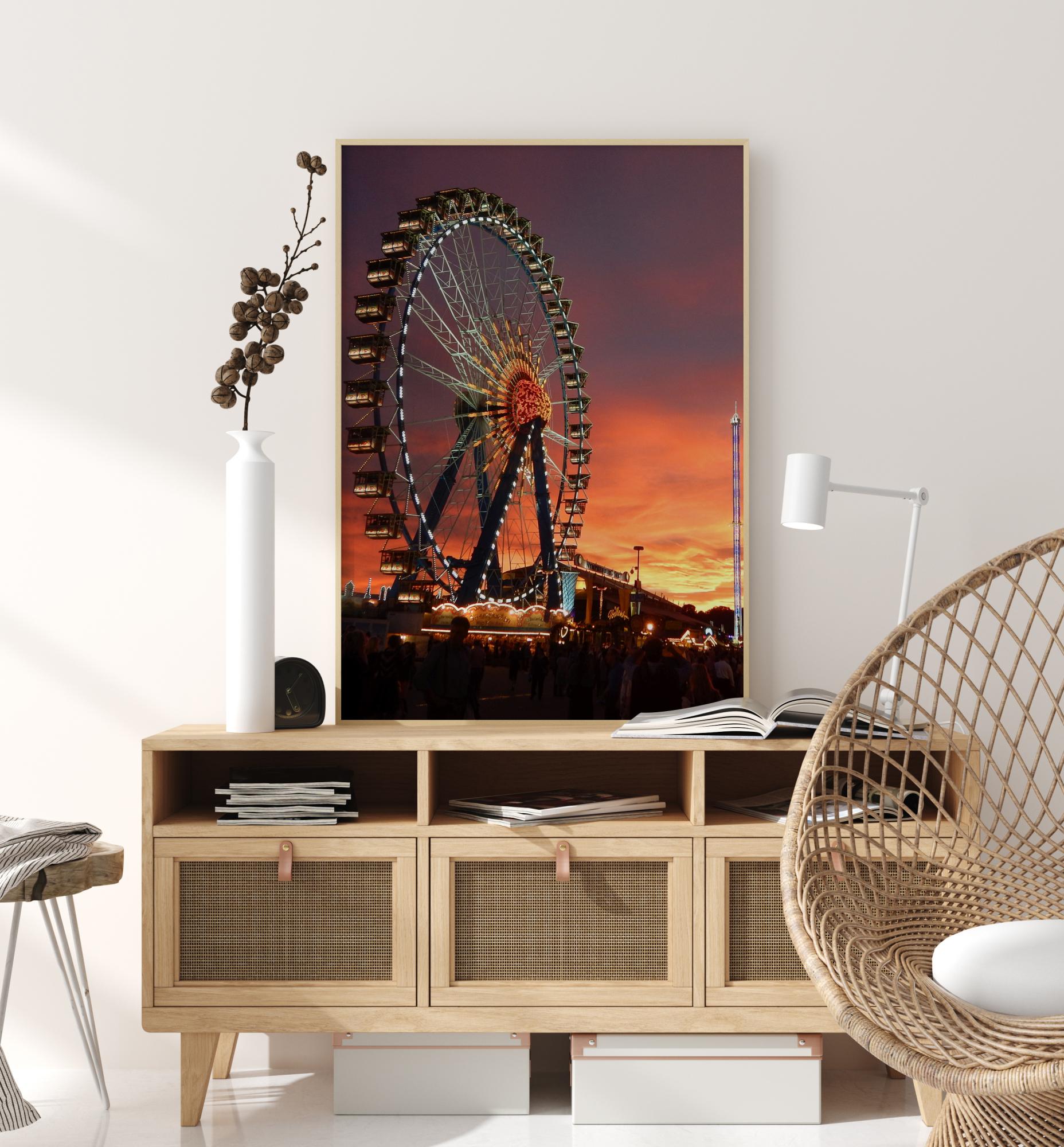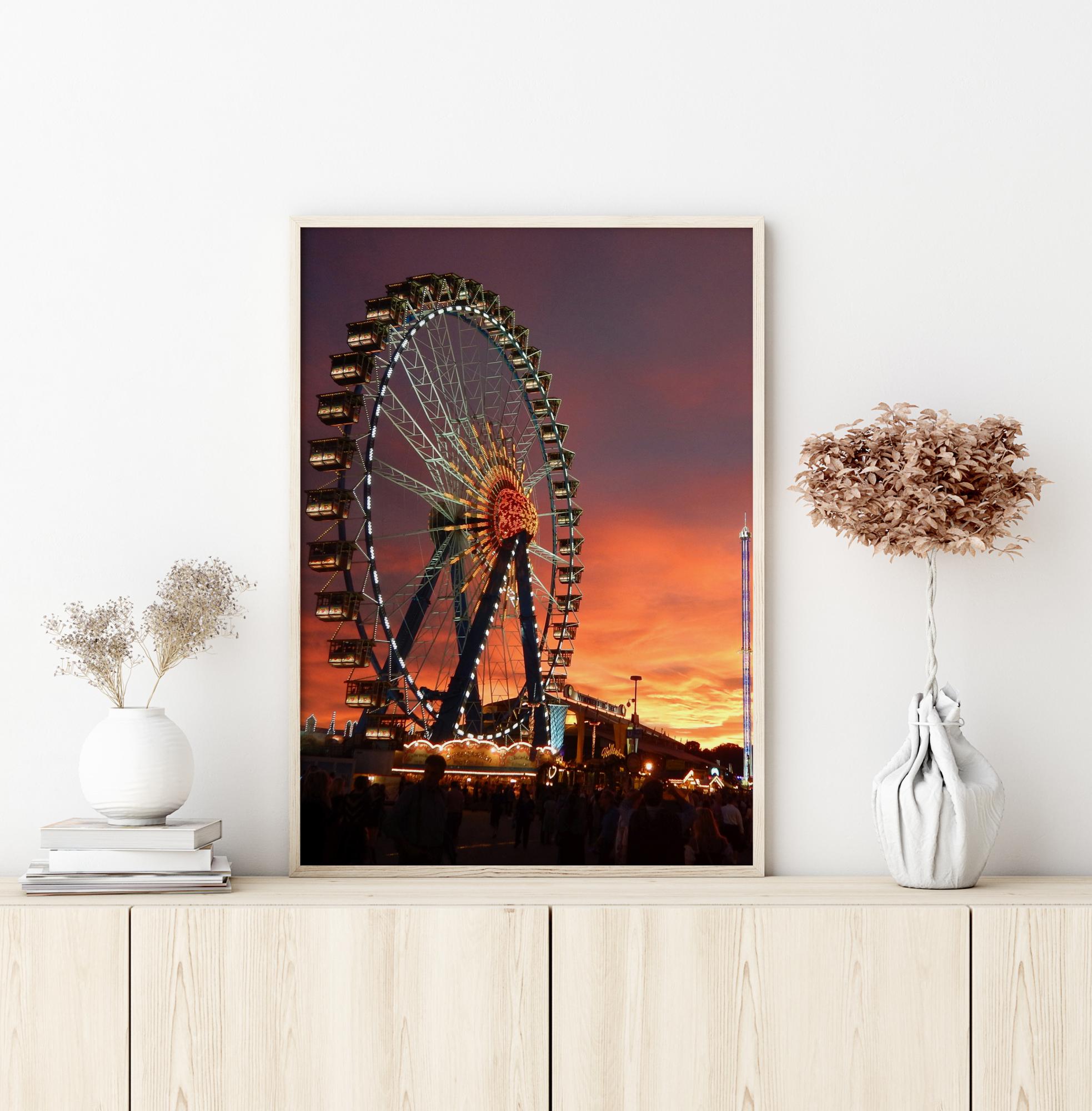 En fantastisk poster med ett pariserhjul i natten. Till vänster står hjulet och lyser med ett glödande sken. Nedanför tittar folkmassor på hjulet medan solen går ner mot en fantastisk orange och lila natthimmel. Få lite nattligt drama på dina väggar med hjälp av den här postern.