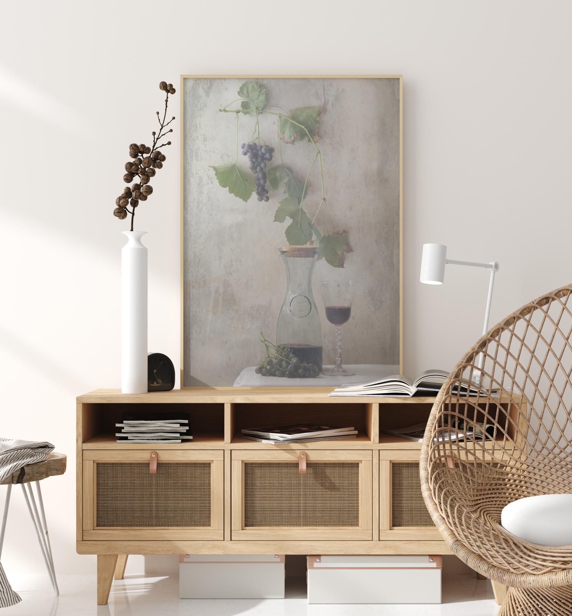 En stilleben poster med en karaff med hemgjort vin, vinglas och en liten kvist med druvor. De mörka lila druvorna och de gröna bladen sitter på en enkel grå vägg vilket gör att de sticker ut. Ta dig till en romersk villa när du har detta eleganta men enkla verk hängande hemma.