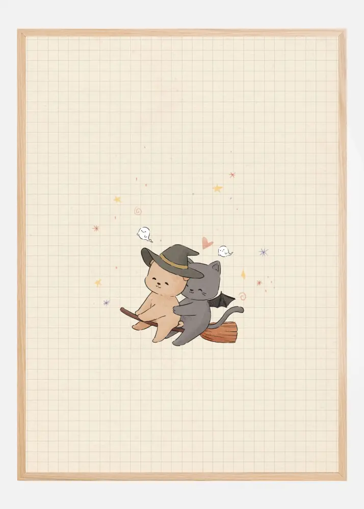 Denna bedårande poster med ett charmigt motiv av en bedårande häxa på en kvast är perfekt för att addera en touch av magi och lekfullhet till vilket rum som helst. Den unga karaktären, klädd i en klassisk häxhatt och svepande kappa, flyger tillsammans med sin trofasta och lättsamma kattkompanjon, vilket skapar en scensom är både fantasifull och hjärtlig. Illustrationens mjuka och varma färgpalett sträcker sig från karamellbrunt och gråtoner till subtila accenter av orange - en kombination som ger en känsla av äventyr och övergång från dag till natt.