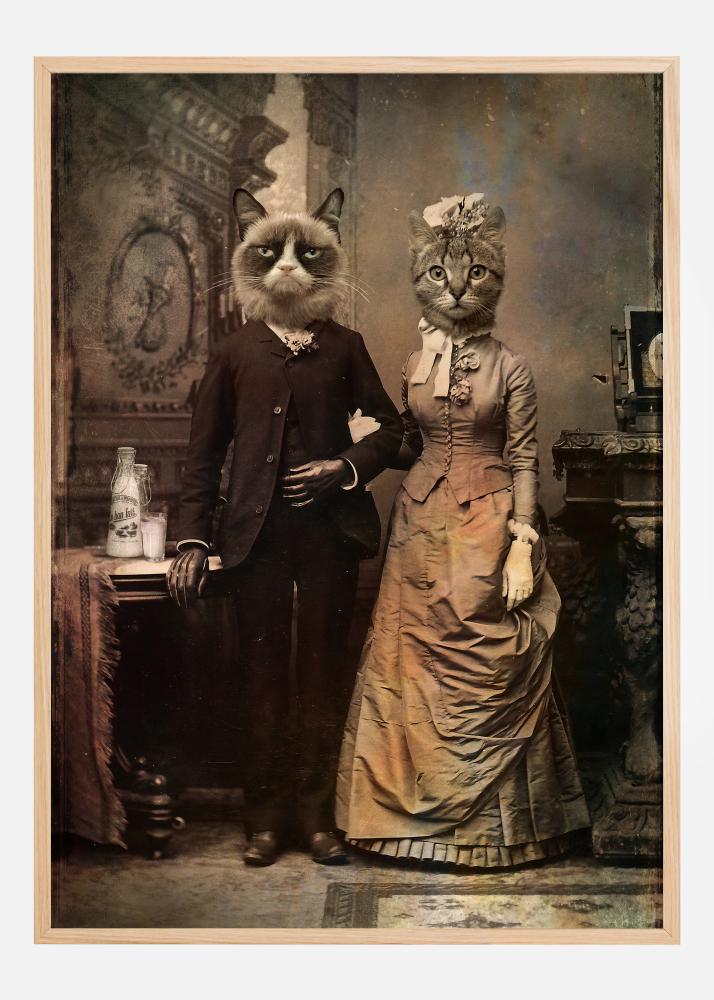 En komisk poster som visar ett kattpar iklädda viktorianska kläder. Sura katten och hans brud står i fullt viktorianskt mode inklusive kostym och korsett i det här sepia-trycket. Bringa till lite skratt i ditt hem med den här bilden på din vardagsrumsvägg.