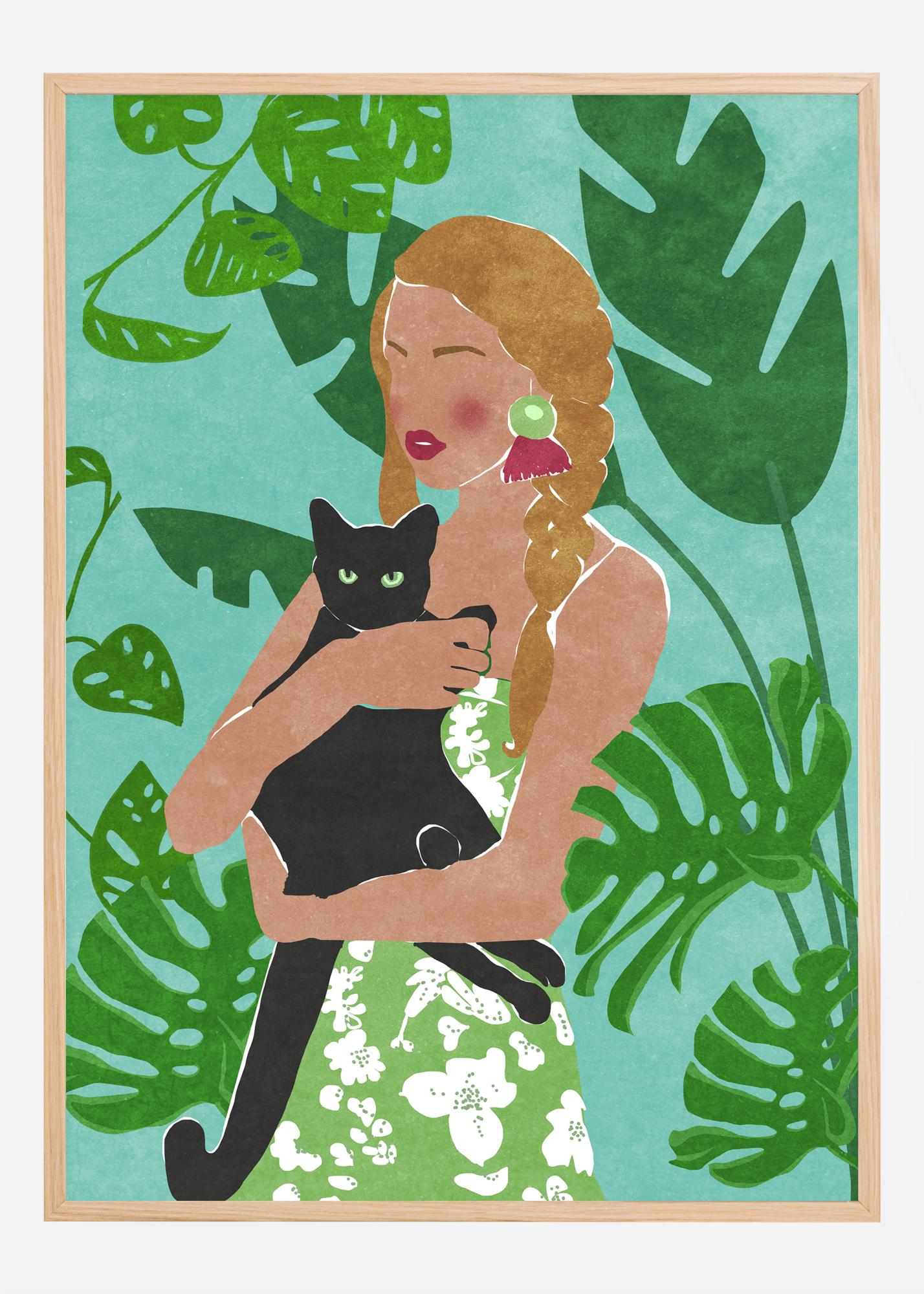 I affischen dominerar lugna och jordnära toner. De gröna nyanserna från växterna och bakgrunden erbjuder en fridfull kontrast mot kvinnans beige och bruna toner, och kattens djupa svarta färg. Detaljerna i den vita klänningen med blomstermotiv tillför en lätthet till kompositionen. Affischen är omgiven av en träram (ej inkluderad i motivet) som ytterligare förstärker den naturliga känslan. Detta är en print som inte bara är en vacker inredningsdetalj utan också ett uttryck för djurvänlighet och en hyllning till livets enkla glädjeämnen.