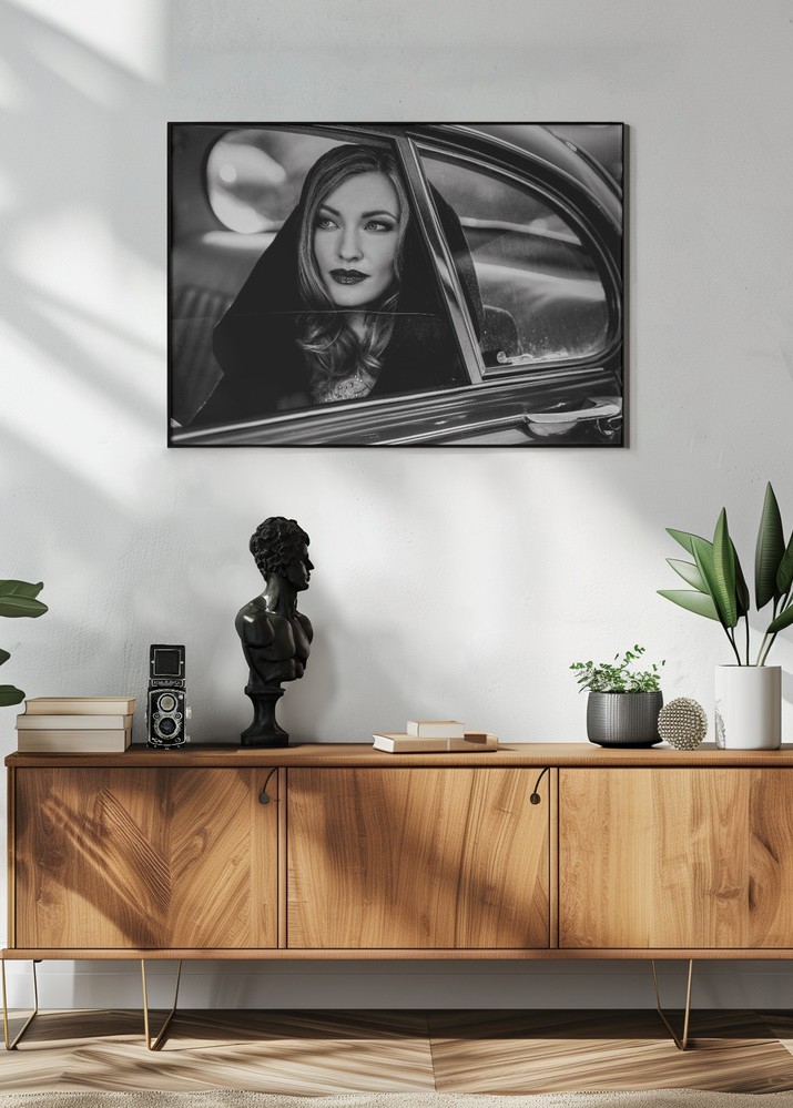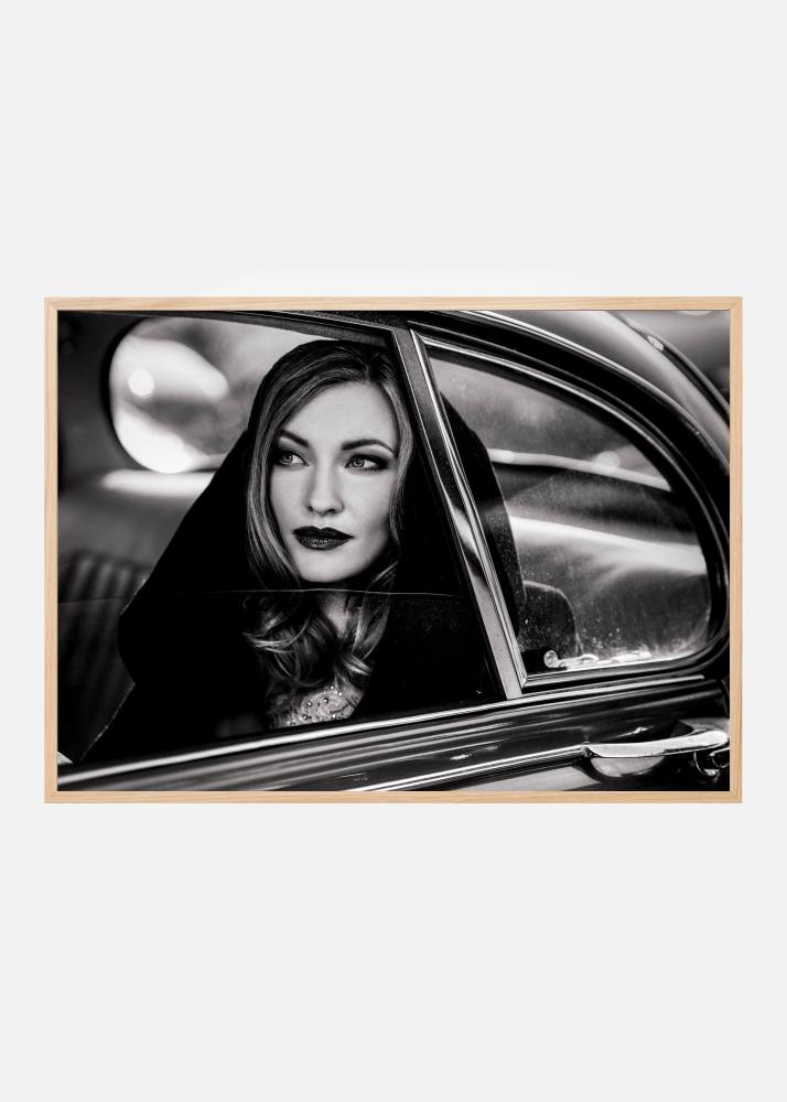 Upptäck en elegant svartvit poster som fångar essensen av tidlös stil och filmisk glamour. Motivet visar en person klädd i en sofistikerad kappa, sittandes i en klassisk bil. Blicken och den omsorgsfulla kompositionen ger en nostalgisk känsla som passar perfekt för att förhöja elegansen i ditt hem eller kontor. Denna poster är ett utmärkt val för dig som uppskattar vintage-estetik och stilfull inredning.