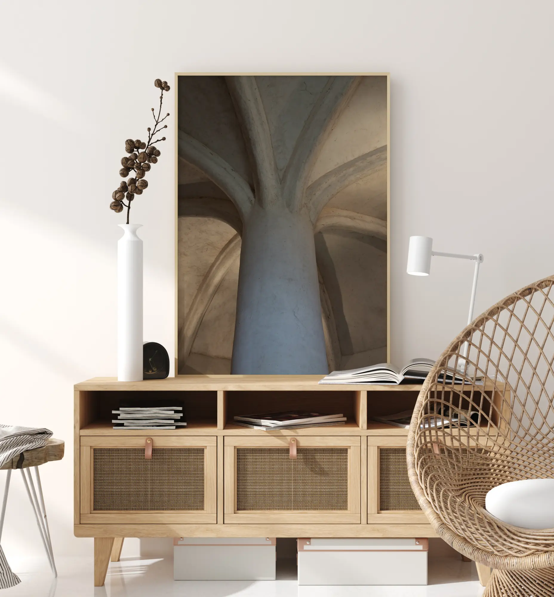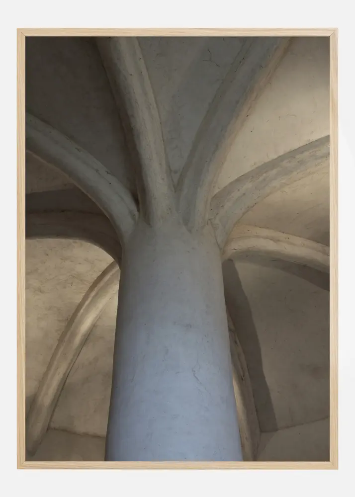 En arkitektonisk poster med insidan av ett kapell eller kyrktak. En enda pelare står i mitten och når taket där åtta valv sprider sig som en blomma. Den kyliga stenen skapar en känsla av storhet som du kan njuta av från hemmet.