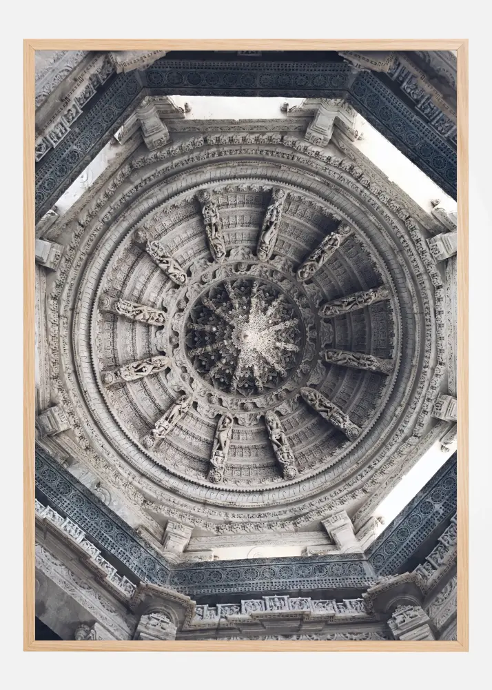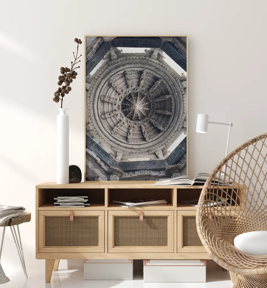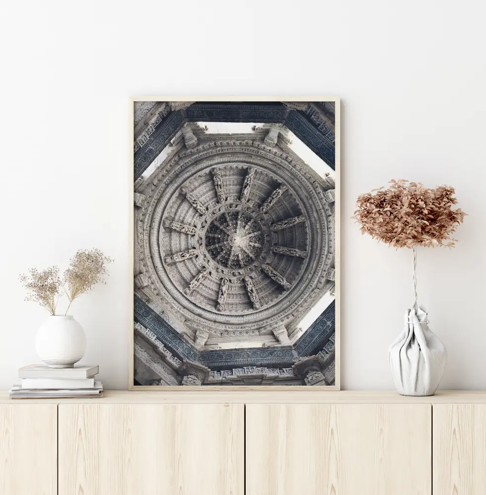 En svartvit poster med ett grått tak. Taket är utformat med cirklar och ser ut som ett fartygshjul. Omgiven av en åttahörning har det geometriska former överallt. Ge en mjukt blå vägg lite extra liv genom att hänga upp denna takposter.