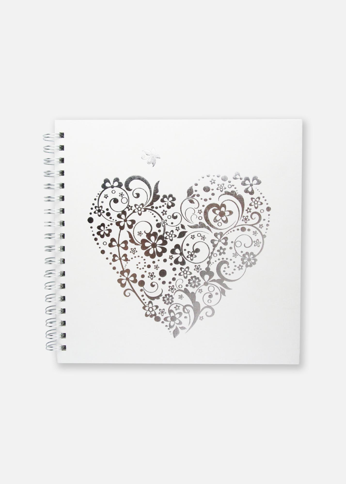 Gulligt, spiralbundet album i vitt i storleken 25x25 cm. På framsidan finns ett silvrigt hjärta tryckt med fina blomdetaljer. Albumet innehåller 24 syrafria blad i vitt och är ett perfekt album att låta ligga framme att bläddra i utan att det tar för mycket plats.