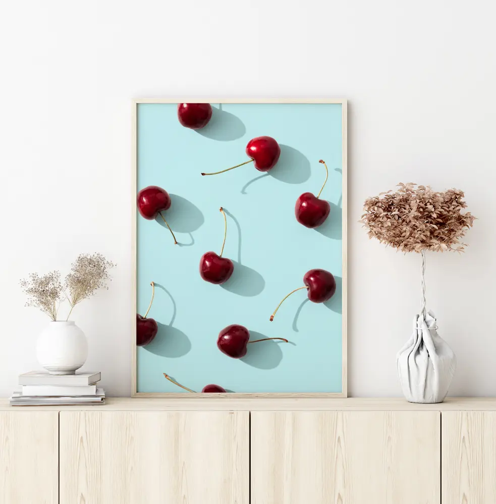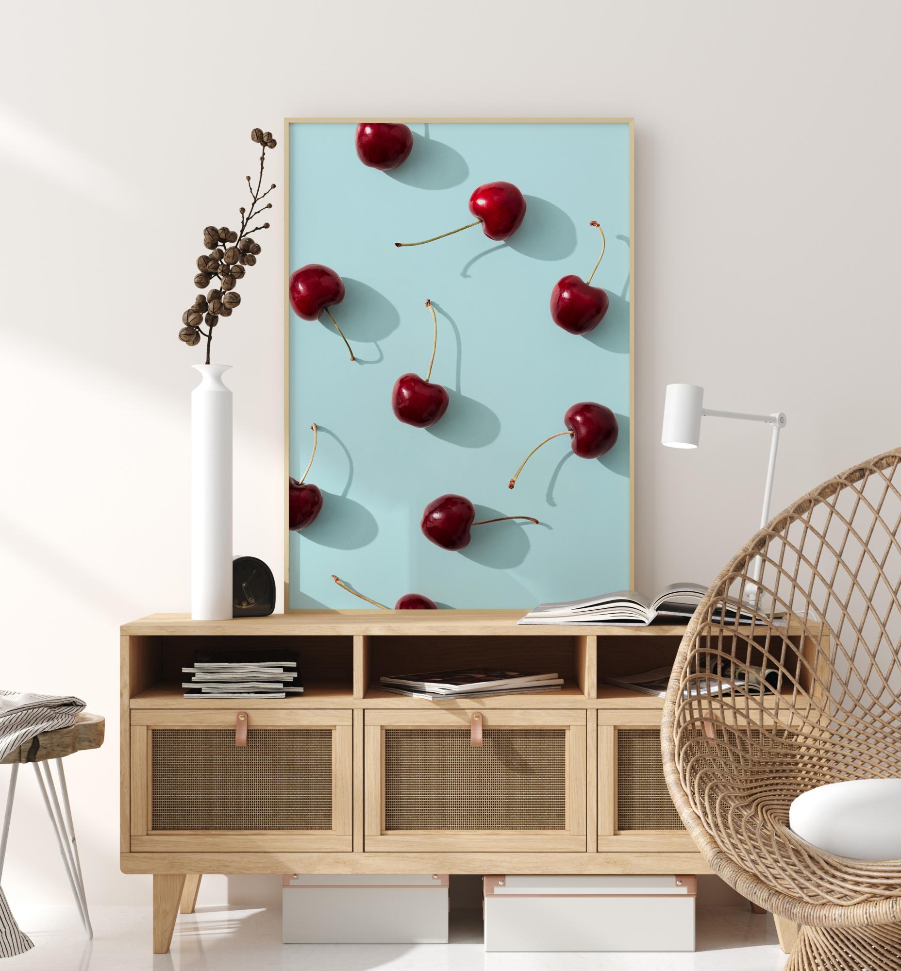 En fruktposter med åtta körsbär på en mjukt blå bakgrund. Ljusa röda körsbär och deras stjälkar kastar skuggor över den enkla turkosa bordsskivan de ligger på. Påminn dig om dina fem om dagen med den här saftiga bilden hängandes i ditt kök.