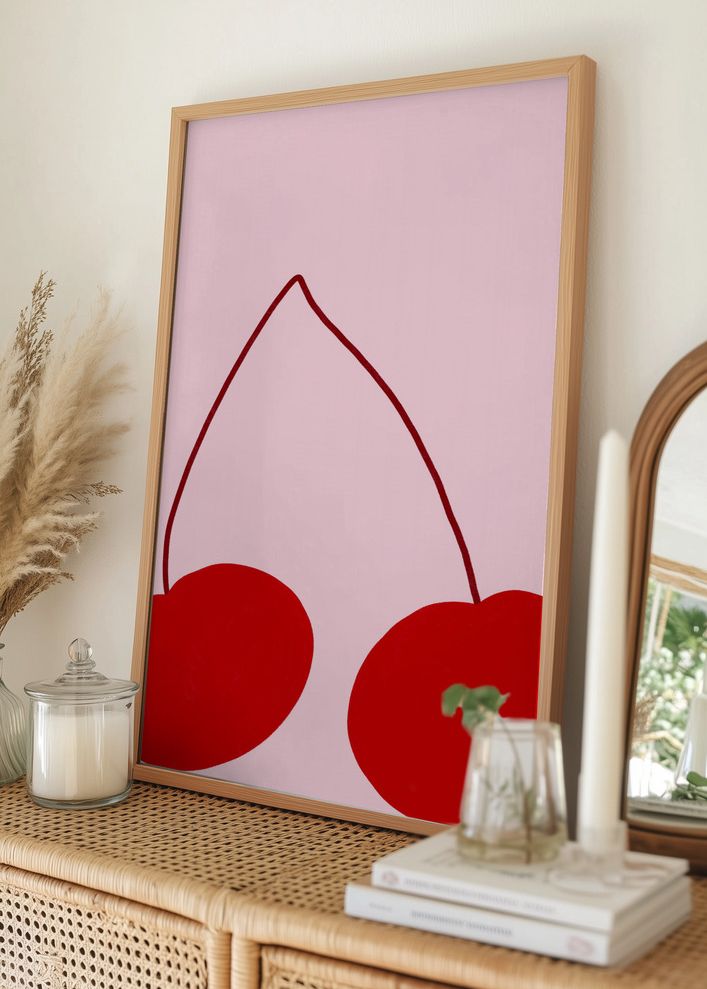 Denna print består huvudsakligen av två färger: rött, som framhävs i de livfulla körsbären, och en ljus rosa bakgrund som skapar en harmonisk kontrast. Dessa färgkombinationer gör affischen till ett utmärkt val för att addera färg och stil till din väggdekoration.