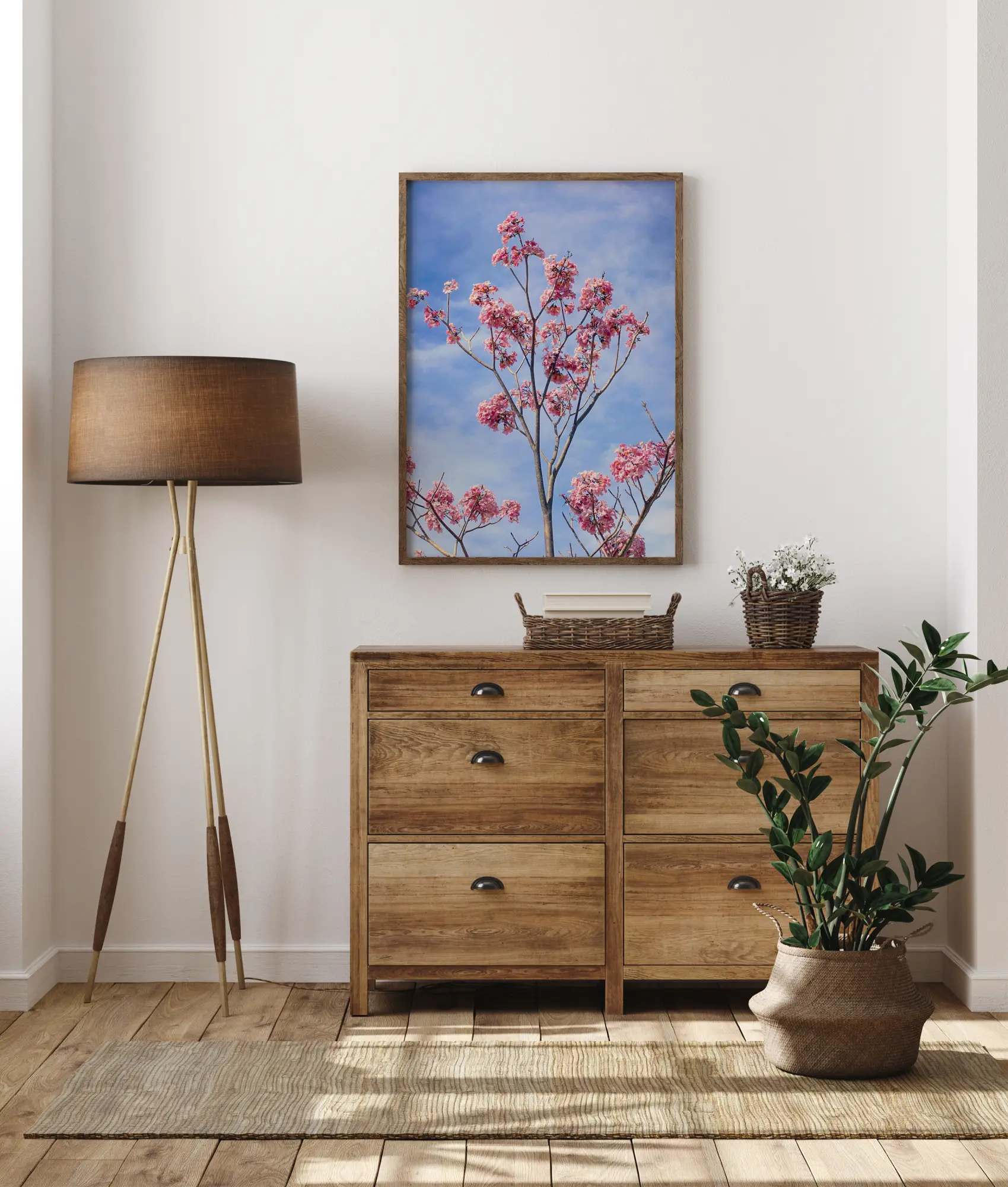 En stark poster med långa grenar av rosa körsbärsblommor. De raka grenarna når upp till himlen och är täckta av livfulla rosa blommor som sticker ut mot himlens blå toner. Ge ditt hem en känsla av natur med den här bilden i ditt hem.