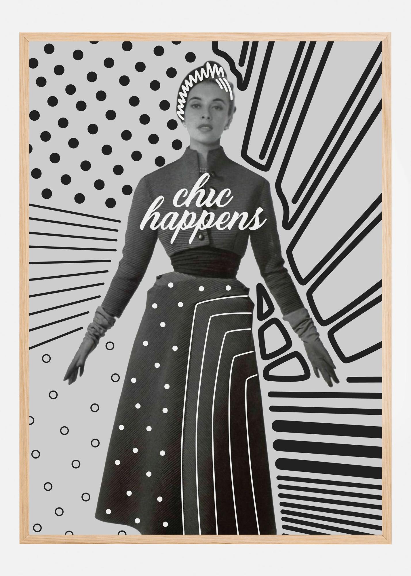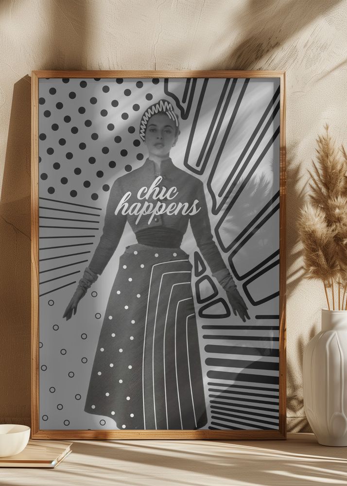 Upptäck vår moderna affisch som kombinerar vintageinslag med samtida design. Denna unika poster framställer en svartvit bild av en kvinna klädd i en stilfull outfit, komplett med en tröja som utstrålar modekänsla med texten "chic happens". Bilden omges av ett dynamiskt mönster av prickar och streck, vilket ger en illusion av rörelse och skapar en konstnärlig balans.