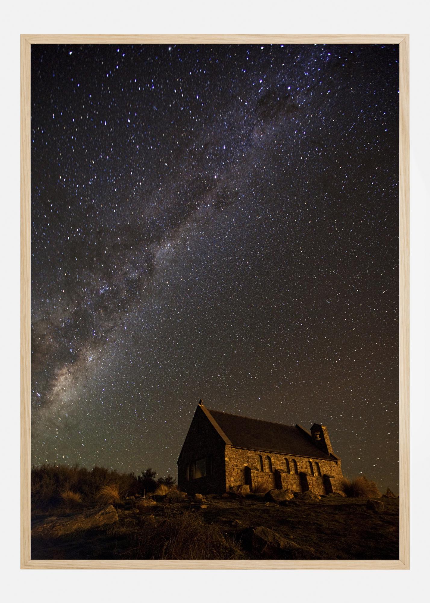 En religiös poster av en gammal stenkyrka med Vintergatan i bakgrunden. Den rustika kyrkan är upplyst av ett mjukt ljus på en kulle. Den ljusa natthimlen är fylld med små stjärnor som utgör vår galax ovanför. Känn vördnaden inför vårt universum i den här bilden.