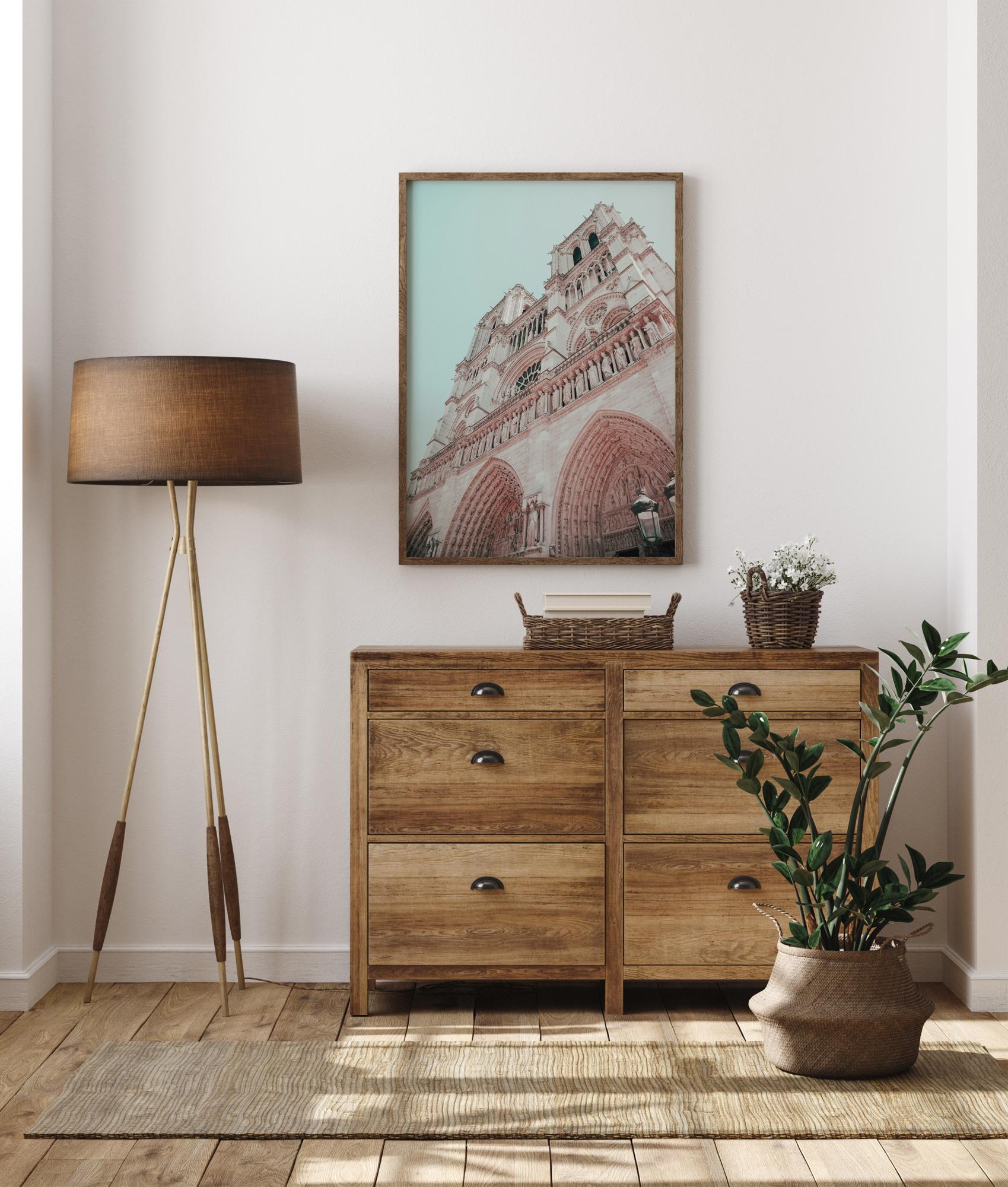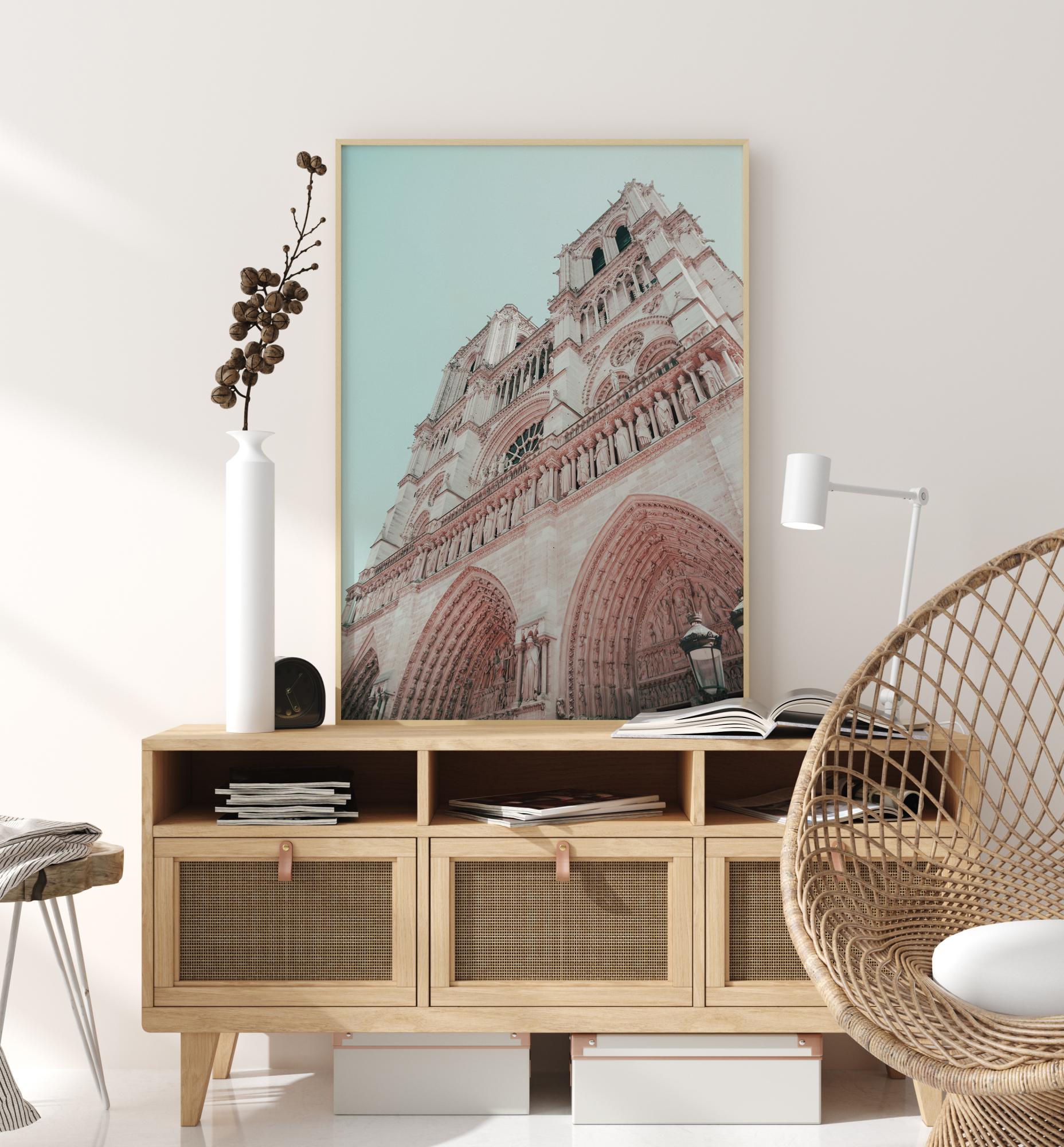 En dramatisk poster av en kyrkfasad. Titta upp längs den här vita och rosa byggnaden med sina gotiska bågar, stenstatyer och runda fönster. De mjuka pastellerna skapar en harmonisk känsla, det perfekta sättet att skapa en lugnande atmosfär hemma.