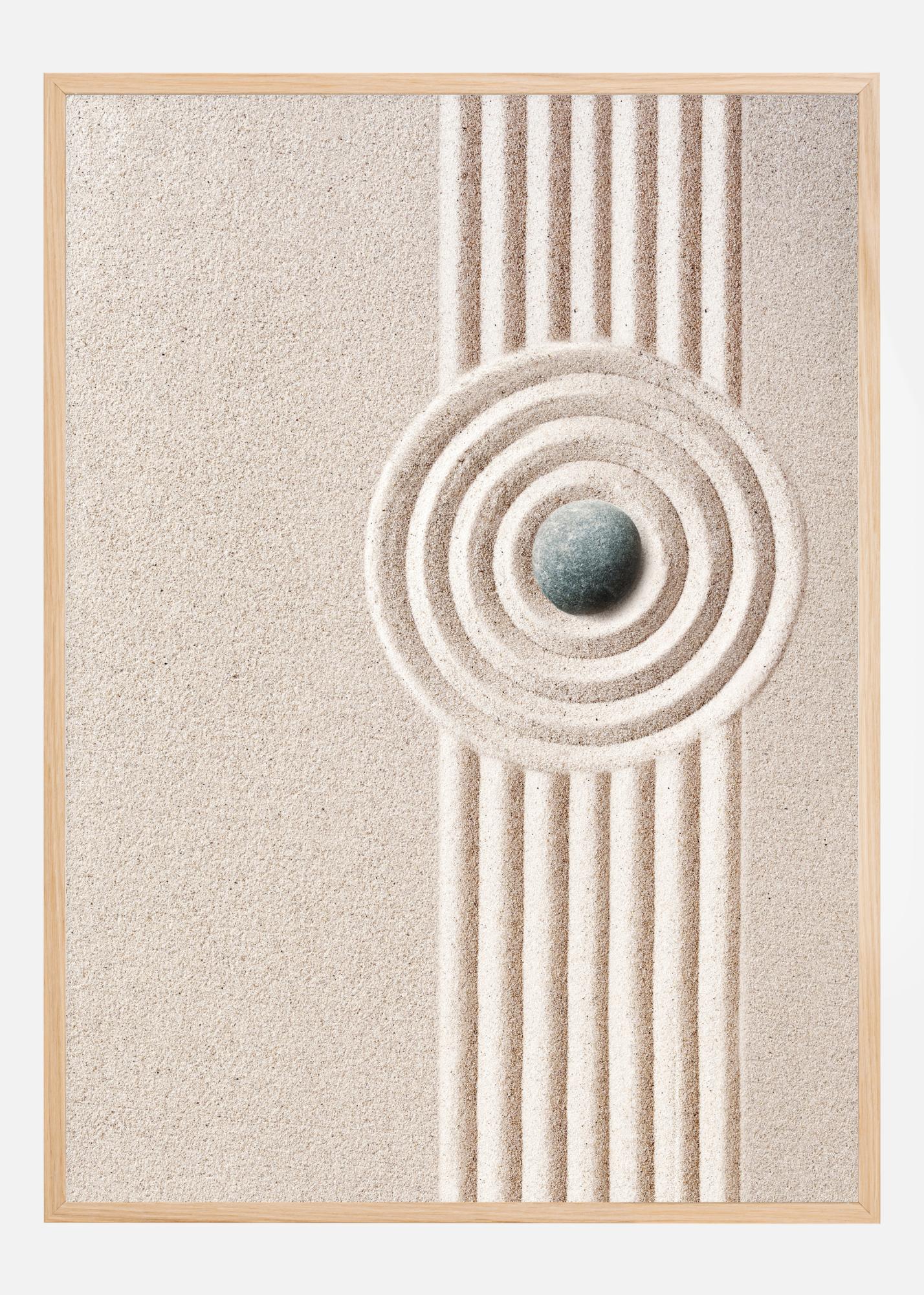 En geometrisk poster av sandformer. Sju vertikala linjer dras i sanden och dessa skärs av en noggrann cirkel med fem ringar. I mitten ligger en enda blågrå sten. Förundras över perfektionen i denna eleganta, poster med geometriska former.