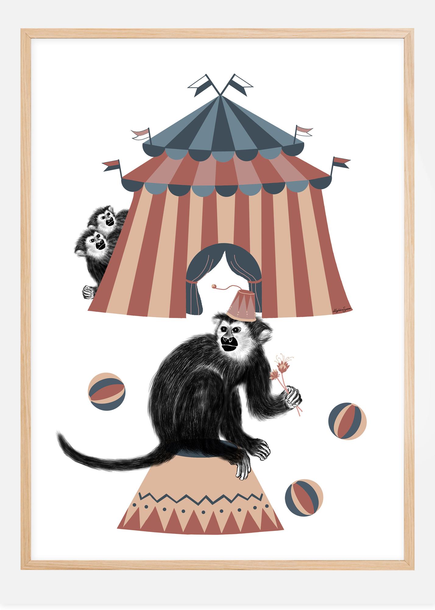 En rolig poster med cirkusapor och ett cirkustält. En apa sitter på en pall och bär en fez samt håller blommor. Tre bollar ligger nedanför. Ytterligare två apor gömmer sig bakom cirkustältet. Ge ditt hus knasighet med den här bilden på en vägg.