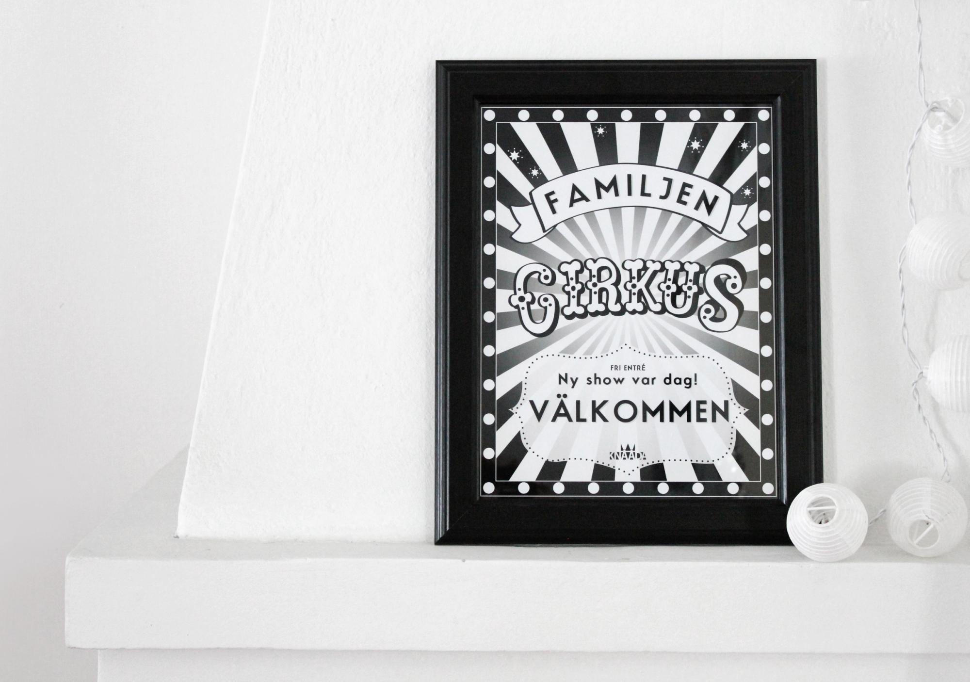 Svartvit cirkustavla som endast har din fantasi som begränsning när det kommer till placering och kombination med övrig inredning. Texten i affischen ”Familjen Cirkus” och ”Fri entré, ny show var dag! Välkommen” bjuder in till fria tolkningar om familjen vars vägg den pryder. Förmodligen en familj med många skratt och tokigheter för sig. Motivet har många detaljer som livar upp och passar därför extra bra med en enfärgad vägg bakom.