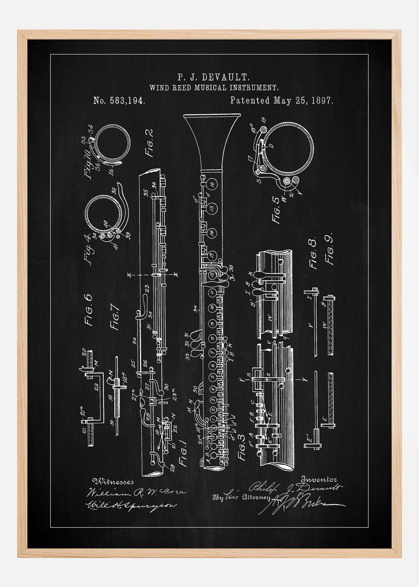 Inför denna ståtliga patent affisch, en hyllning till musikalisk innovation och design. Denna poster framställer P.J. DeVaults klarinett, ett patent utfärdat den 25 maj 1897 under nummer 583,194. Denna exakta reproduktion av den ursprungliga patentritningen skildrar instrumentets komplexa mekanik och skönhet, en perfekt accent för alla rum där musik och historia uppskattas.