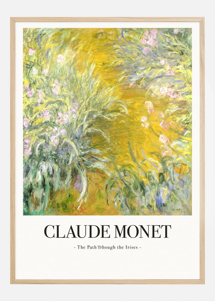 Posterens titel, 'The Path Through the Irises', introducerar oss till Claude Monets vision av sin trädgård, en plats som gav honom oändlig inspiration. Denna målning, som strömmar med livliga gula och gröna toner, kompletterade med de karakteristiska lila och rosa irisarna, fångar betraktarens blick och inbjuder till en promenad längs den osynliga stigen. Monets signatur är diskret placerad i hörnet, vilket förstärker konstverkets autenticitet och dess historiska betydelse.