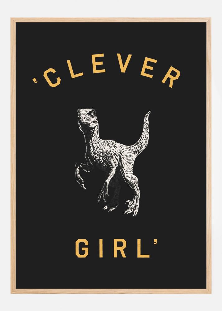 Färgpaletten är minimalistisk men uttrycksfull, med den krispigt vita dinosaurien och den elegant gyllene texten "CLEVER GIRL", som skapar ett starkt intryck. Denna affisch är perfekt för de som älskar klassiska citat och önskar addera en touch av retro-coolhet och sofistikerad humor till sitt hem eller kontor. Notera att motivet presenteras i en ekram, men det är själva illustrationen som är i fokus, och de nyanser som dominerar är svart, vitt och guld.