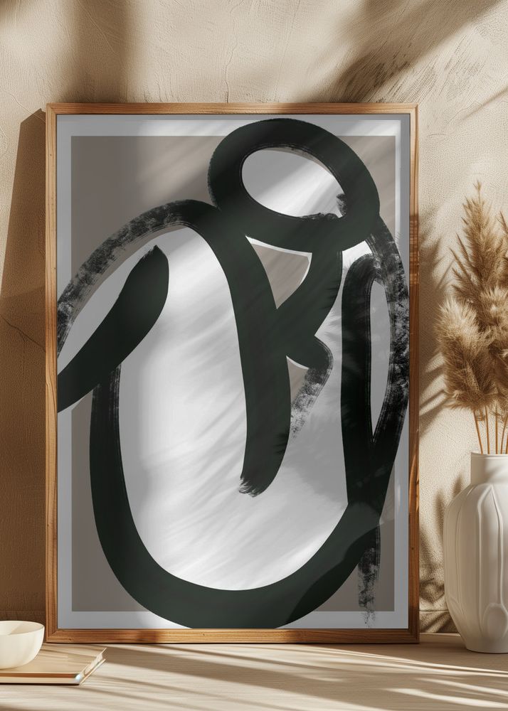 Denna samtida poster föreställer en abstrakt komposition som balanserar mörka och ljusa element på ett konstfullt sätt. Det kraftfulla, svarta motivet som dominerar bilden är svängt och expressivt, vilket ger en känsla av rörelse och energi. Bakgrunden i en sober taupefärg skapar en elegant och diskret kontrast till det svarta, vilket gör att denna print kan komplettera en mångfald av inredningsstilar.