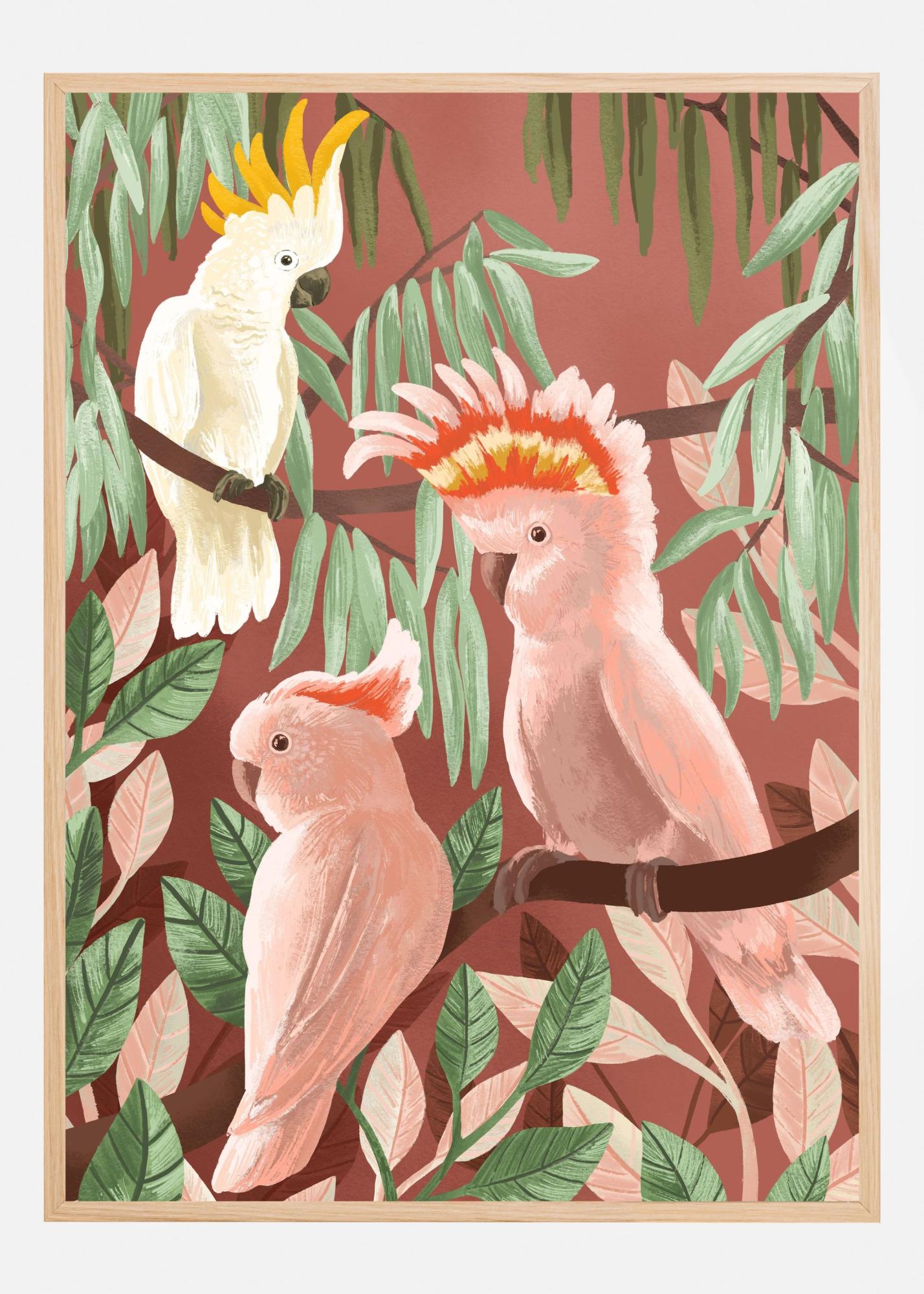 Skapa en tropisk känsla i ditt hem med denna charmiga poster som fångar skönheten hos exotiska fåglar. Denna konstfulla affisch presenterar en trio av färgsprakande kakaduor, med en kritvit, en blekrosa och en med toppen av fjädrarna i flammiga toner av orange och gul. De sitter omgivna av ett hav av frodiga gröna blad som skapar en naturnära och lugnande atmosfär. Motivet tar plats på en varm, terrakottaröd bakgrund som framhäver de naturliga färgerna hos fåglarna och bidrar till en harmonisk färgpalett som sprider värme och liv i vilket rum som helst.