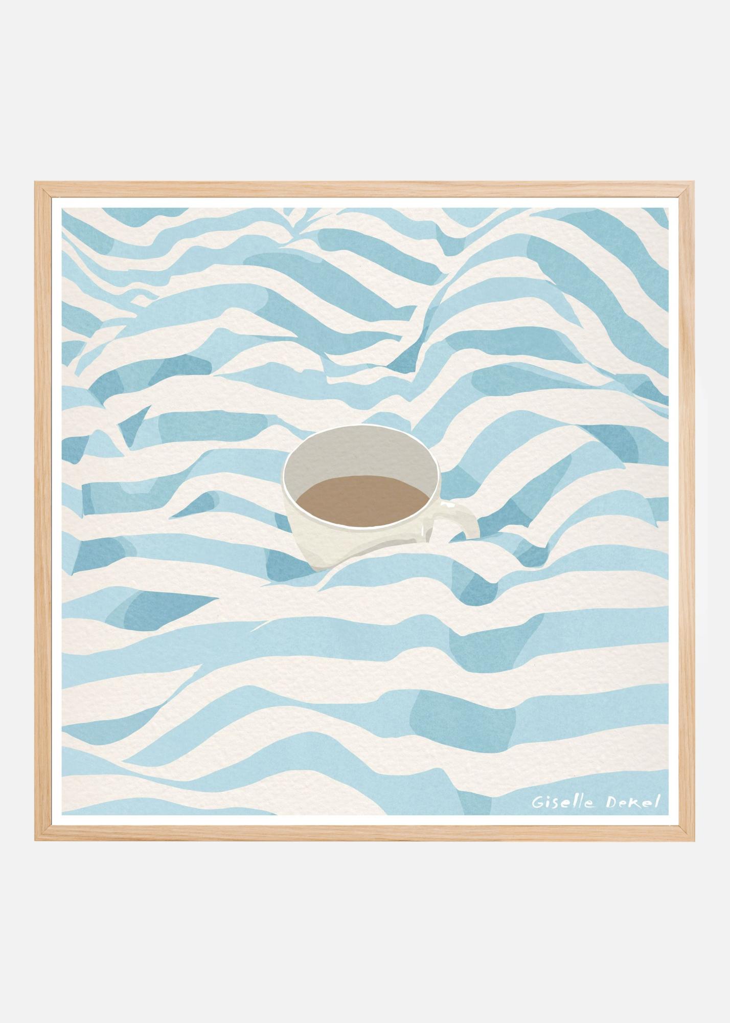 Färgpaletten består av mjuka blå toner och vita nyanser som kontrasterar elegant mot den varma brunfärgen i koppen. Dessa färger ger affischen en lugnande och fräsch känsla, vilket gör den till en idealisk dekoration för kök, vardagsrum eller kontor.