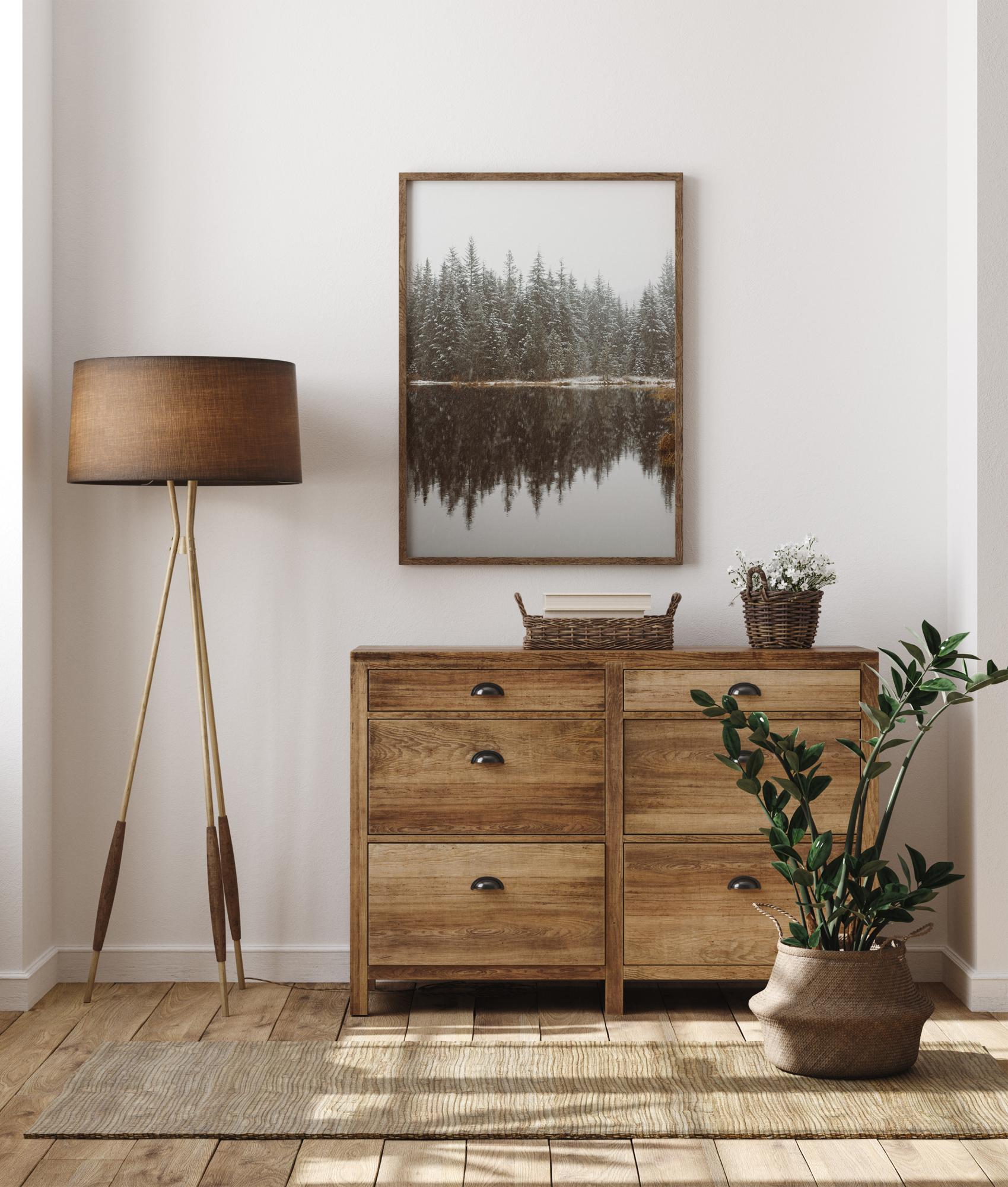 En julposter med snötäckta granar vid på kanten av en sjö. Granarna kastar perfekta reflektioner i sjön för att skapa en lugn, men ändå kylig, scen. Ta med vintern in i ditt hem med detta fantastiskt vackra naturfoto och var glad att du är varm inomhus.