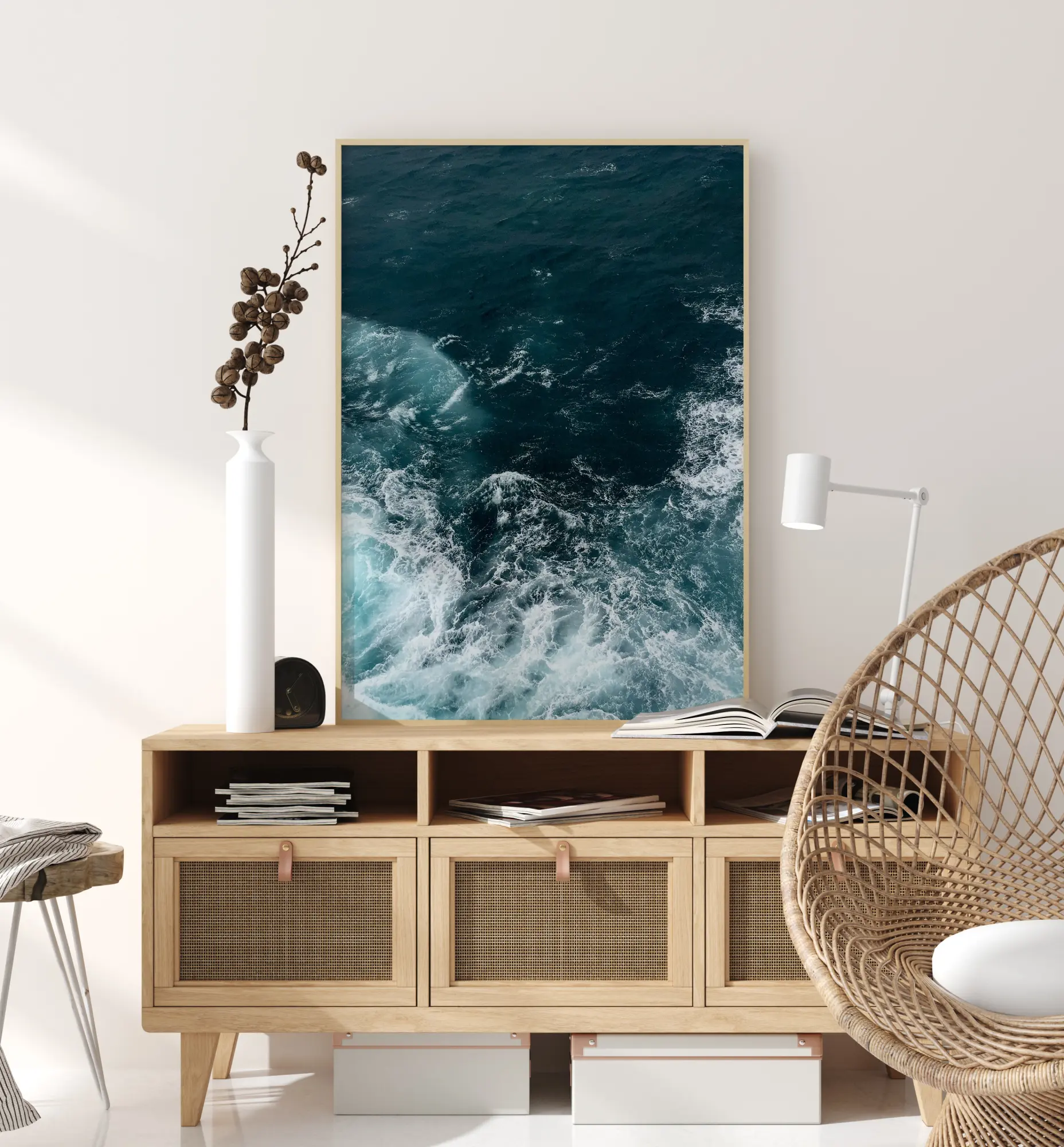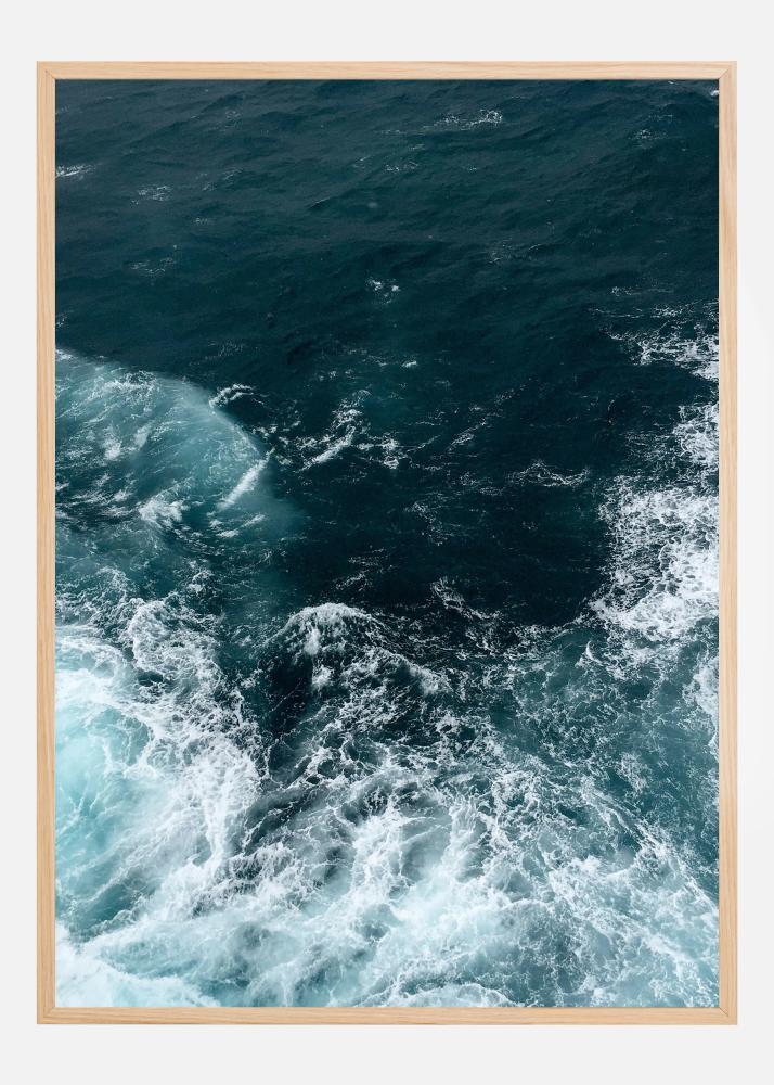 En havsposter med vågor som slår och virvlar i det öppna havet. Vitt skum virvlar runt i bildens nedre kant för att få en lugnare ton av mörk akvamarin. Tänk dig att du är i en båt på vågorna med hjälp av den här fantastiska bilden.