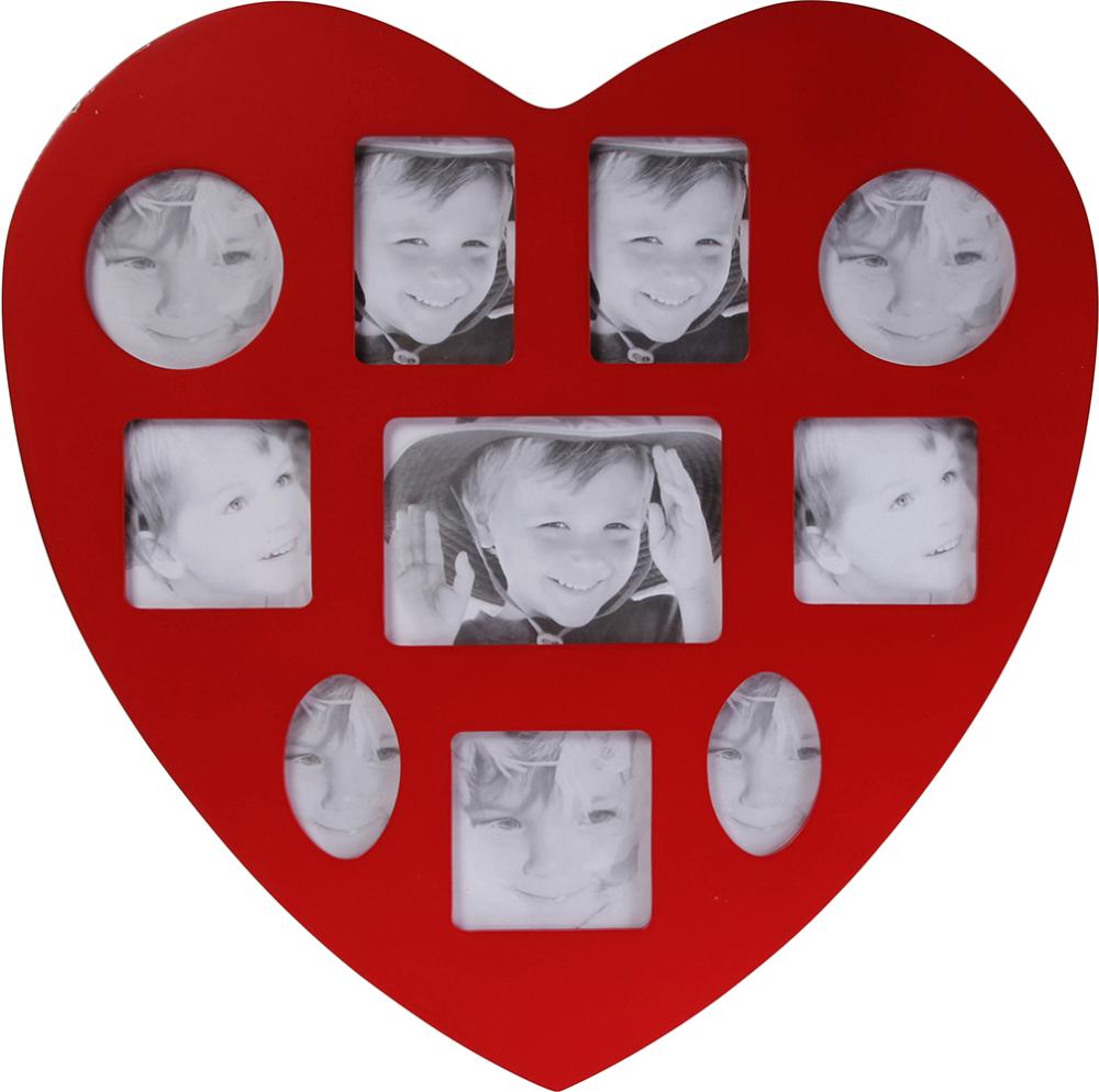 Gullig röd hjärtformad collageram med plats för 10 bilder i varierande storlekar.