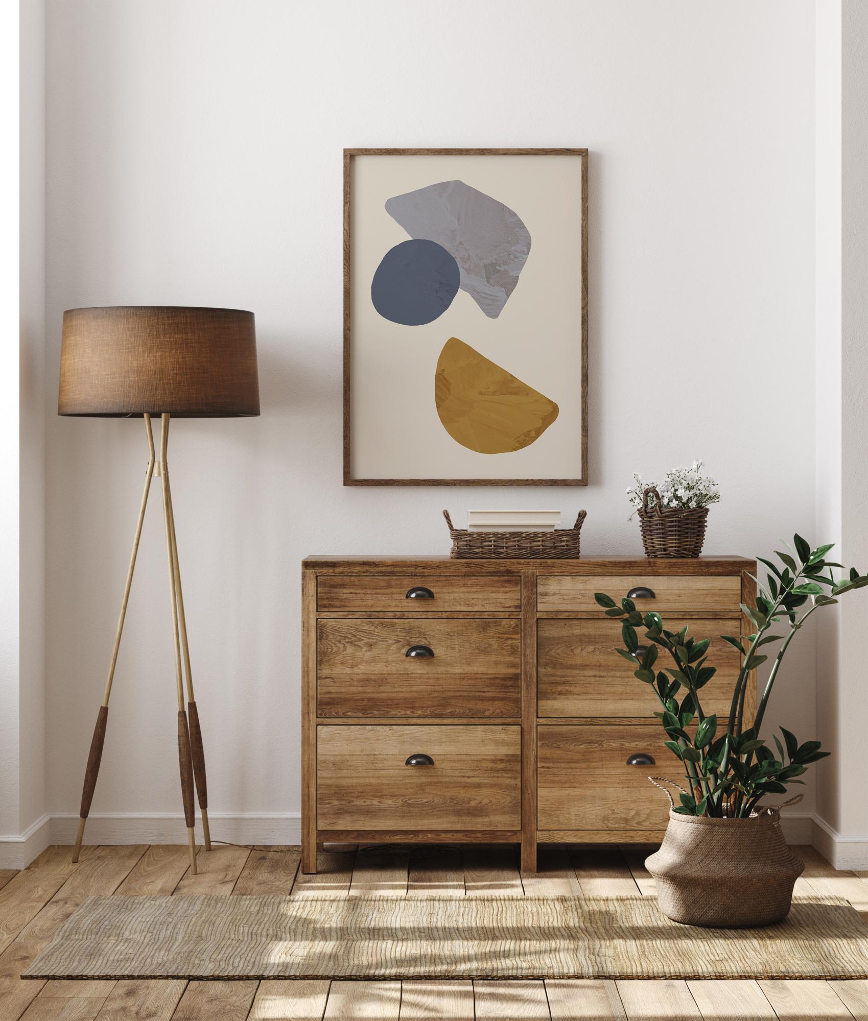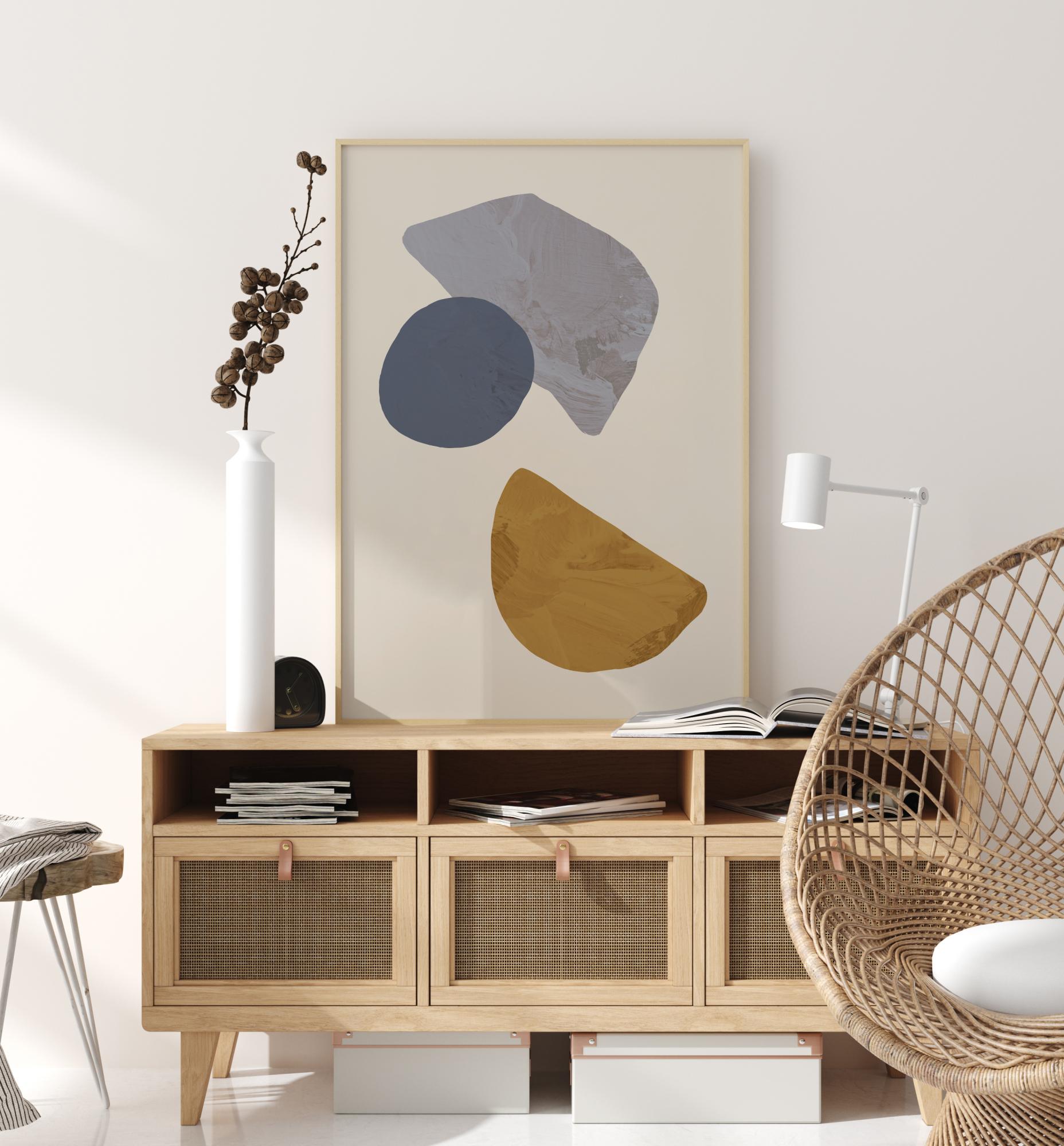 En abstrakt poster med tre olika former och färger. En brun halvcirkel är placerad i botten med en ljusblå linje i mitten av bilden. Ovanför finns en mörkgrå halvcirkel. Allt mot en vit bakgrund. Häng upp det här verket på någon slät vägg för bäst effekt.